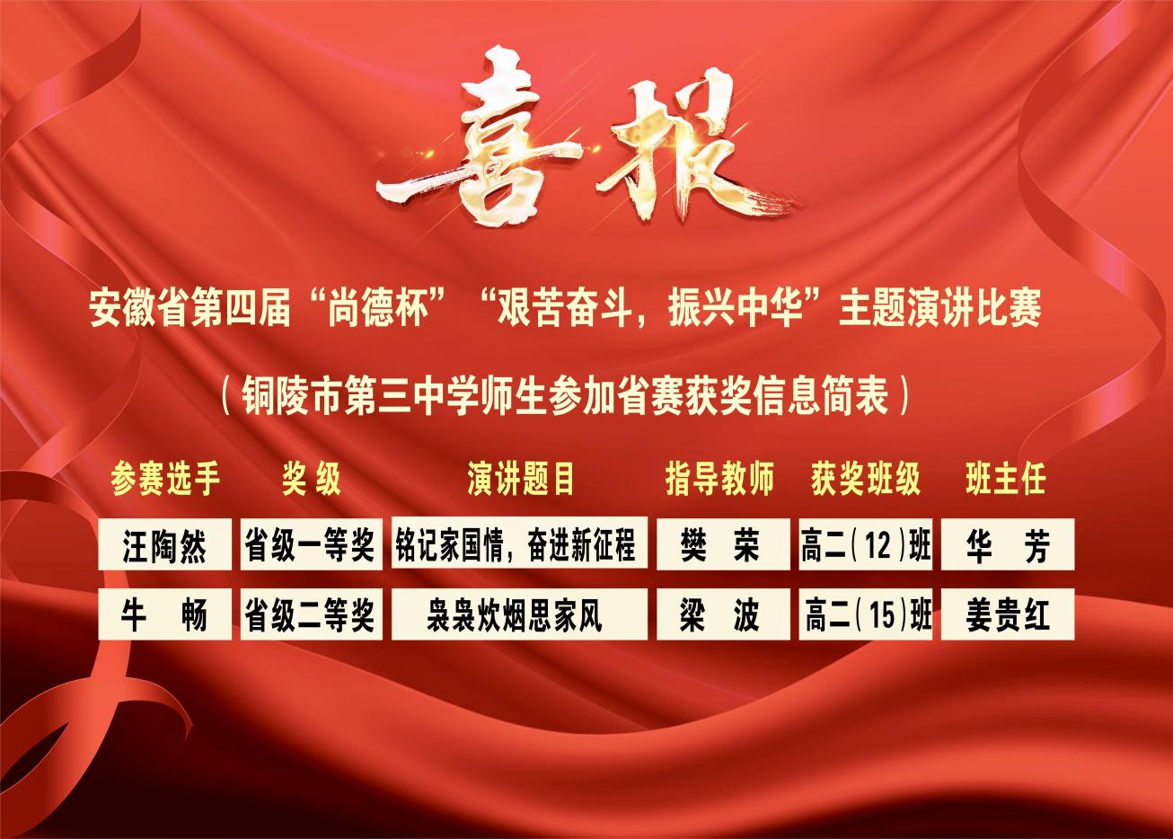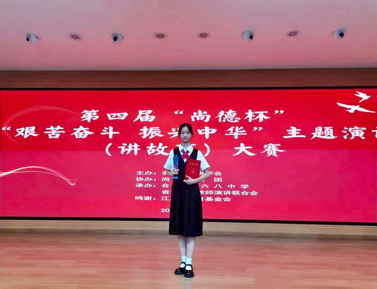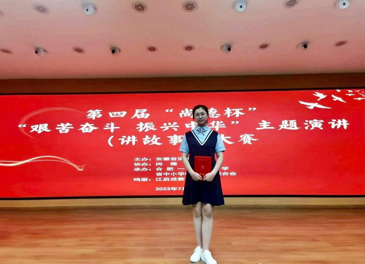 为深入学习贯彻习近平新时代中国特色社会主义思想,培育和践行社会主义核心价值观,促进和提升青少年的演讲与口才能力,培养自信、积极、有为、担当的优秀学子。7月10日,安徽省演讲学会在合肥举行第四届“尚德杯”“艰苦奋斗,振兴中华”主题演讲比赛。我校两名优秀选手参加比赛,分别取得省赛一等奖和二等奖的好成绩,可圈可点!