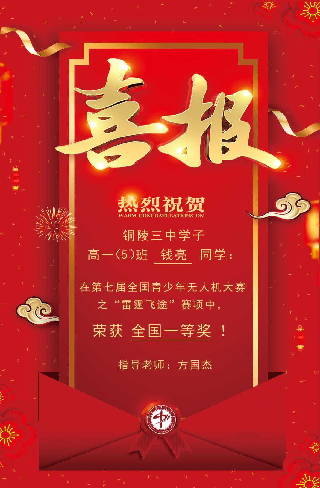 2023年8月10日至8月13日第七届全国青少年无人机大赛在美丽的山城重庆举行。经过激烈角逐,我校高一(5)班钱亮同学在方国杰老师的悉心指导下,在国青少年无人机大赛“雷霆飞途”赛项中斩获全国一等奖!这是安徽省在此项赛事中获得的最高奖项!