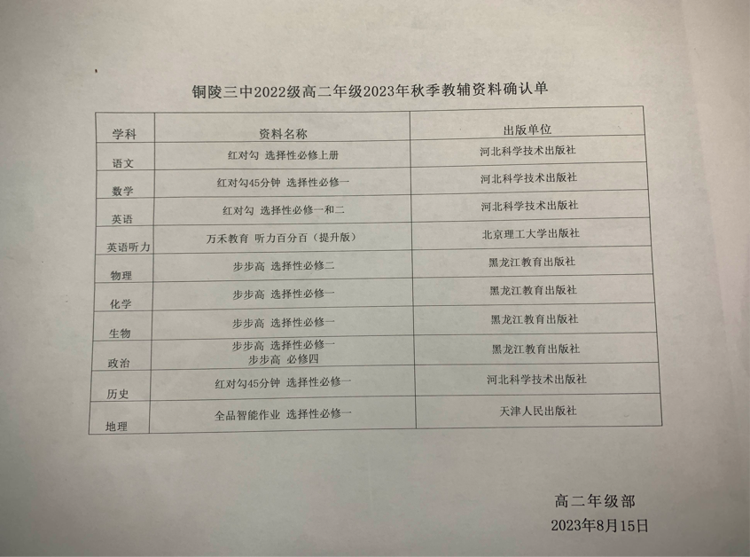2023年8月7日—2023年8月14日,高二年级部在铜陵三中校园网上对本校2022级高二年级教辅资料进行公开招标。近日对投标单位进行资格审查,符合条件的一共有5家单位,符合开标要求。评议小组对符合条件的单位提供的教辅资料进行现场打分,年级部家长代表现场拆封资料报价单,并做出选择,确定选择以下资料提供给各班级学生选择使用,现将具体情况公示如下:
