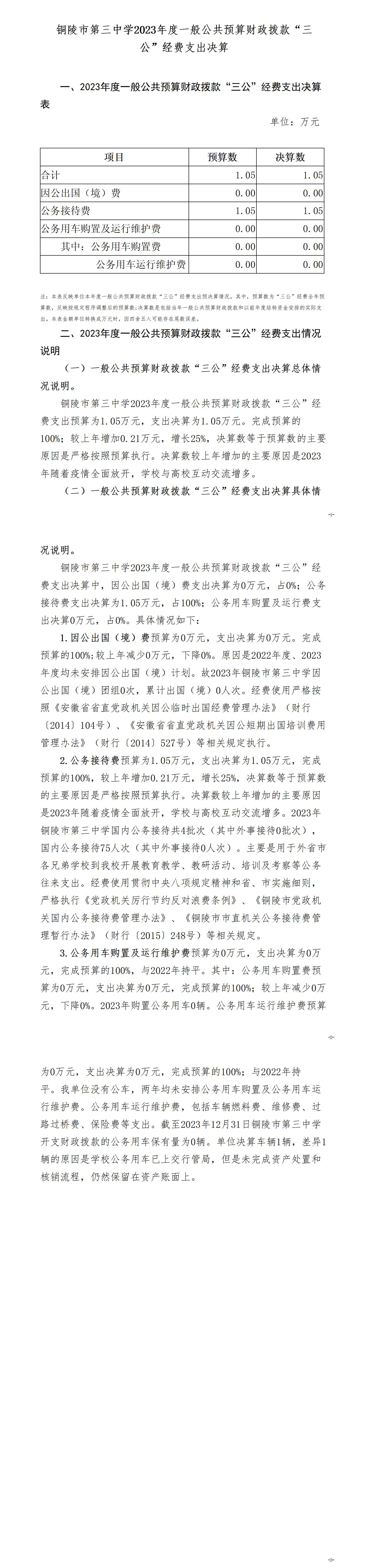 铜陵市第三中学2023年度一般公共预算财政拨款“三公”经费支出决算