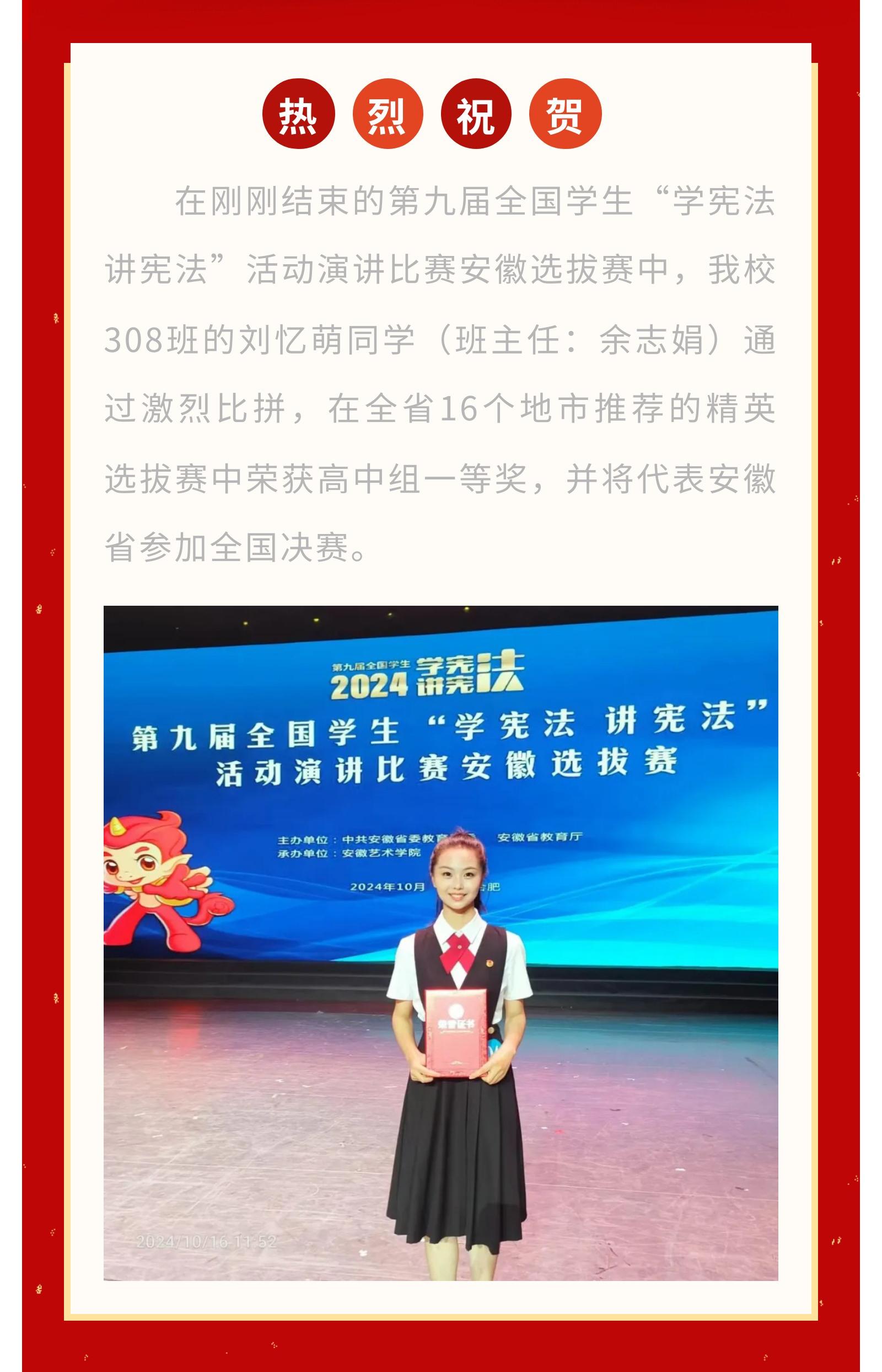 祝贺!我校刘忆萌同学荣获省赛一等奖并将代表安徽省参加全国决赛