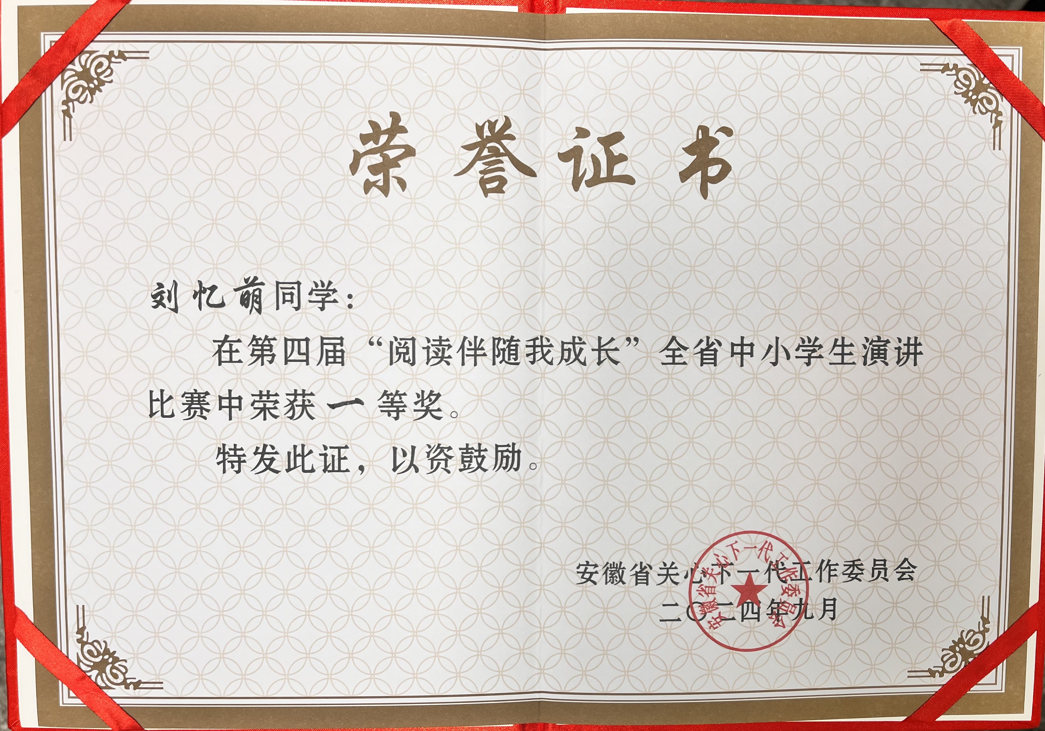 为庆祝新中国成立75周年,2024年9月27日下午,由安徽省关心下一代工作委员会主办的第四届“阅读伴随我成长”全省中小学生演讲比赛在合肥举行。来自全省各地市的16名优秀选手齐聚一堂,我校高三(8)班刘忆萌同学作为铜陵市选手代表参加,她凭借极强的现场表现力,获得本次比赛一等奖!