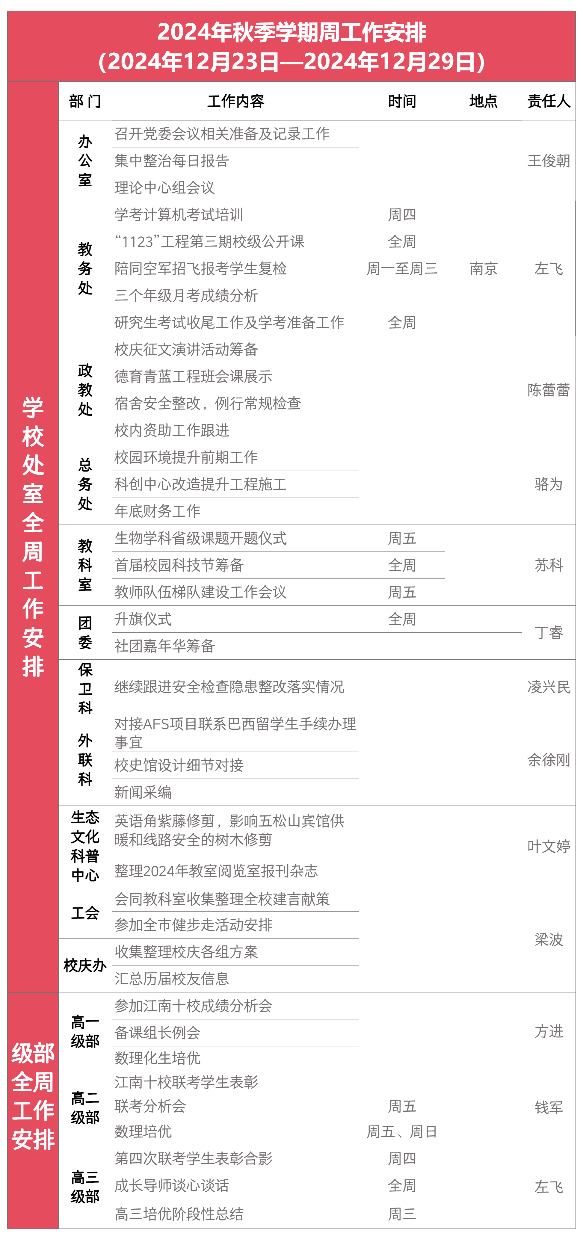 铜陵三中2024年秋季学期周工作安排(2024年12月23日-2024年12月29日)