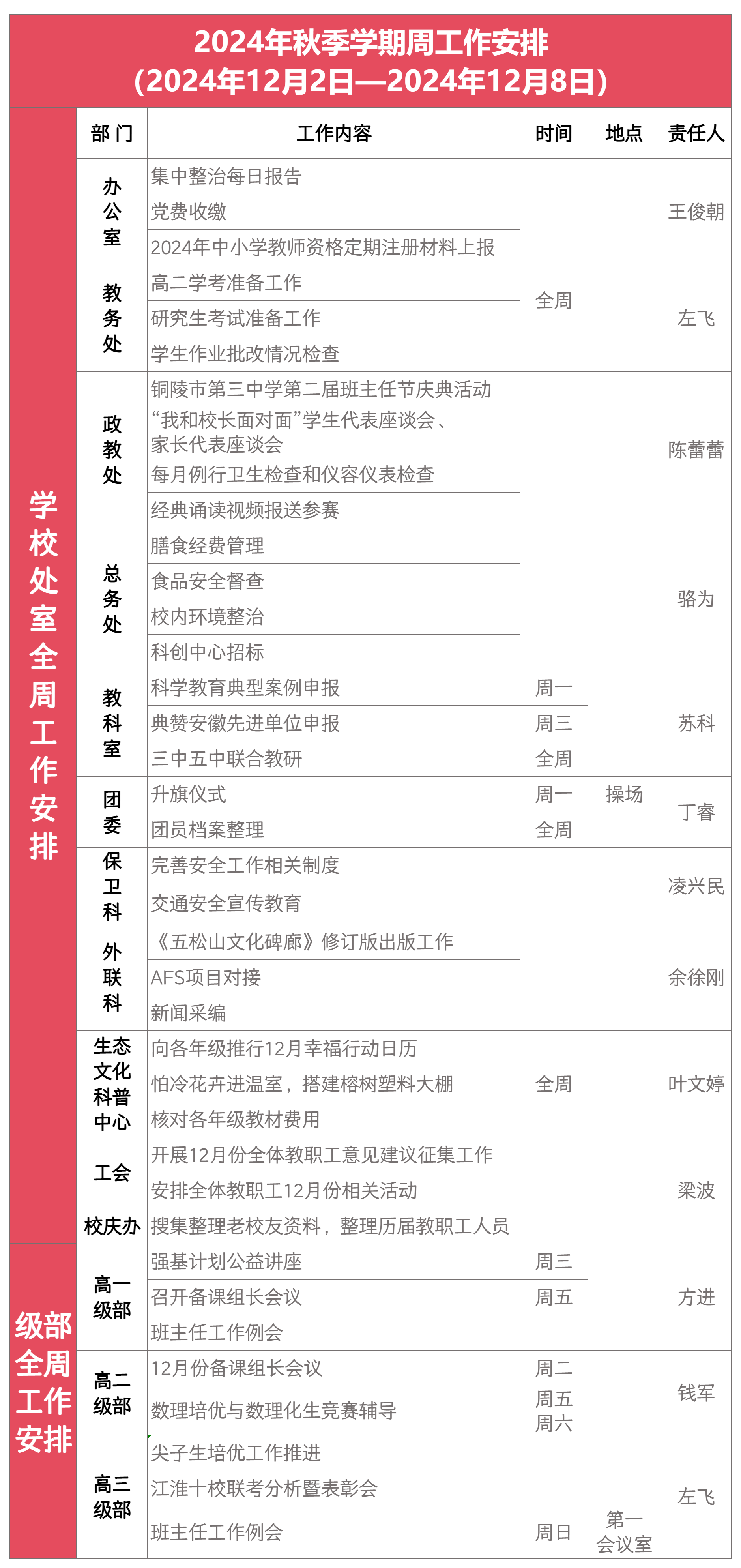 铜陵三中2024年秋季学期周工作安排(2024年12月2日-2024年12月8日)