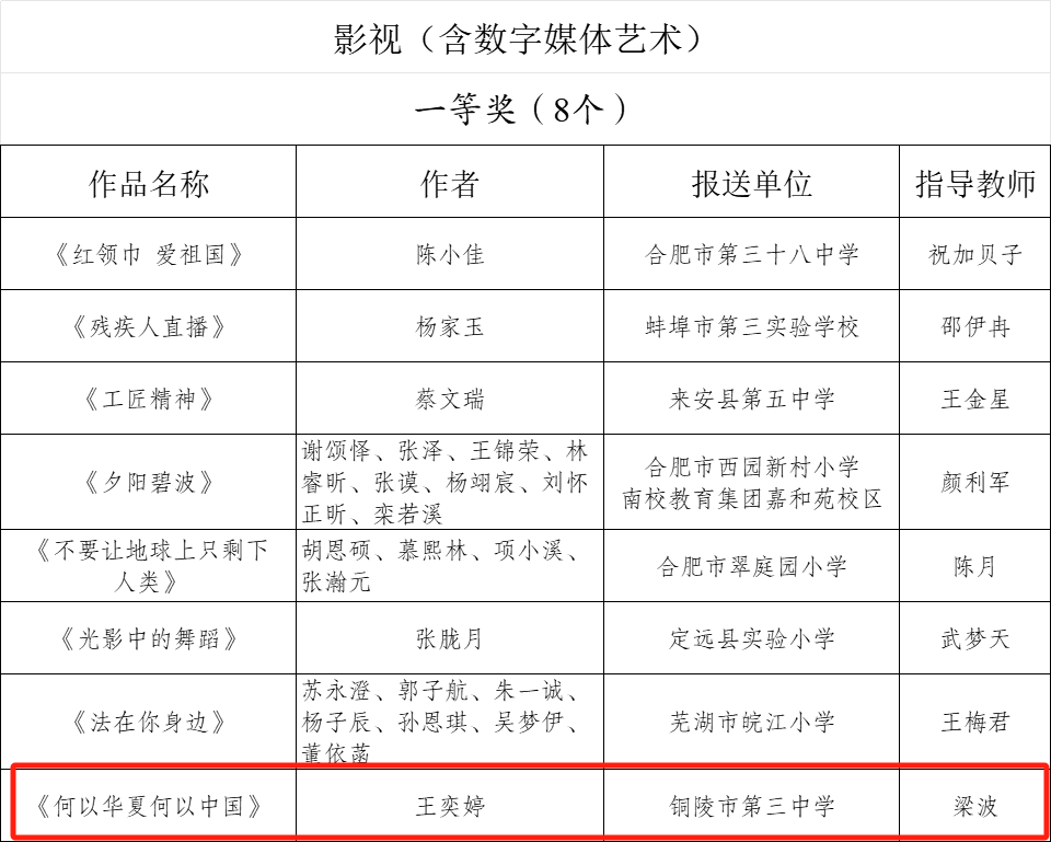 近日,在安徽省第八届中小学生艺术展演评比中,铜陵市第三中学高三(4)班的王奕婷同学凭借其沙画情景朗诵作品《何以华夏何以中国》荣获一等奖。