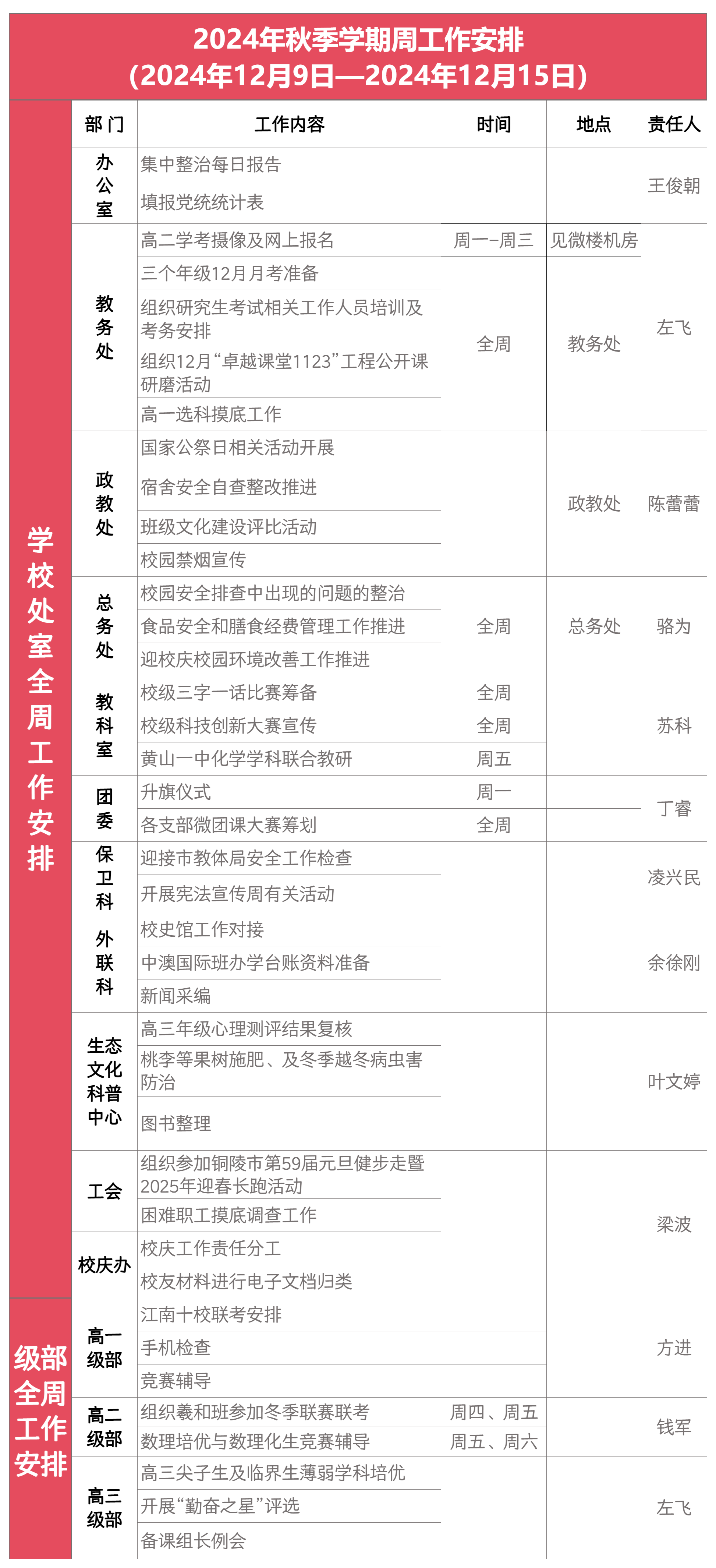 铜陵三中2024年秋季学期周工作安排(2024年12月9日-2024年12月15日)