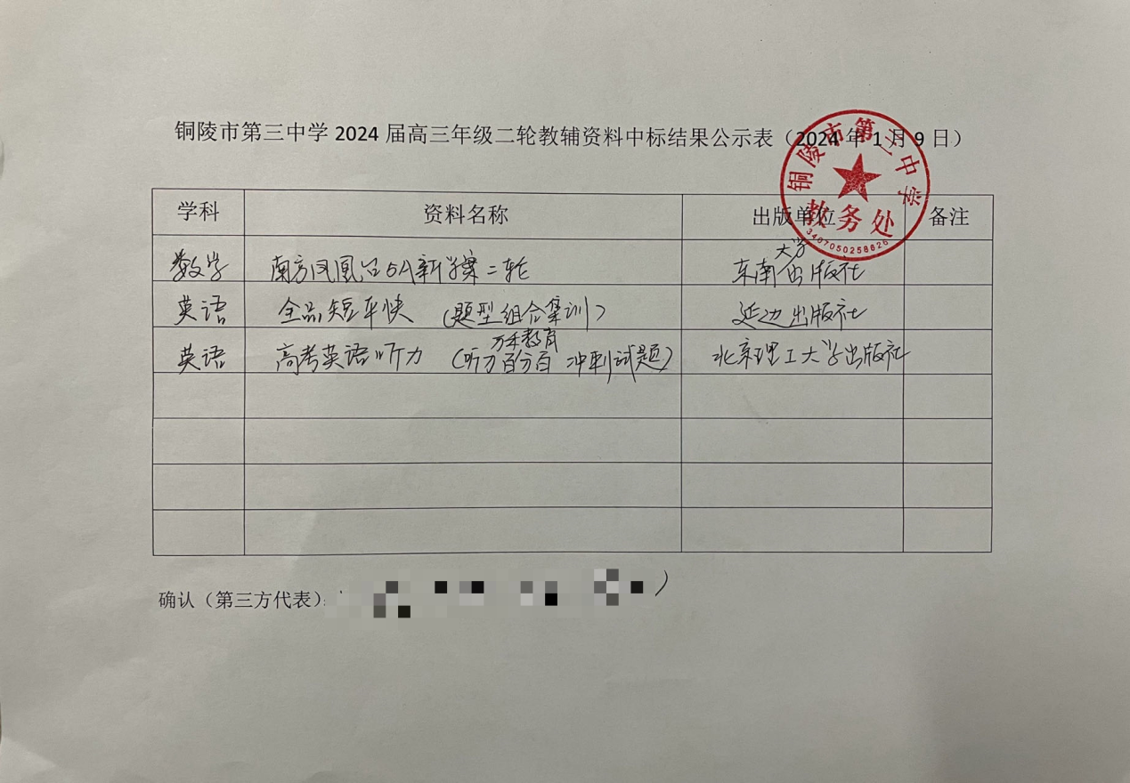 2024年1月4日—2024年1月7日,高三年级部在铜陵三中校园网上对本校2024届高三年级二轮部分教辅资料进行公开招标。2024年1月9日对投标单位进行资格审查,符合条件的一共有3家单位,符合开标要求。评议小组对符合条件的单位提供的教辅资料进行打分,年级部家长代表现场拆封资料报价单,并做出选择,确定选择以下资料提供给各班级学生选择使用,现将具体情况公示如下: