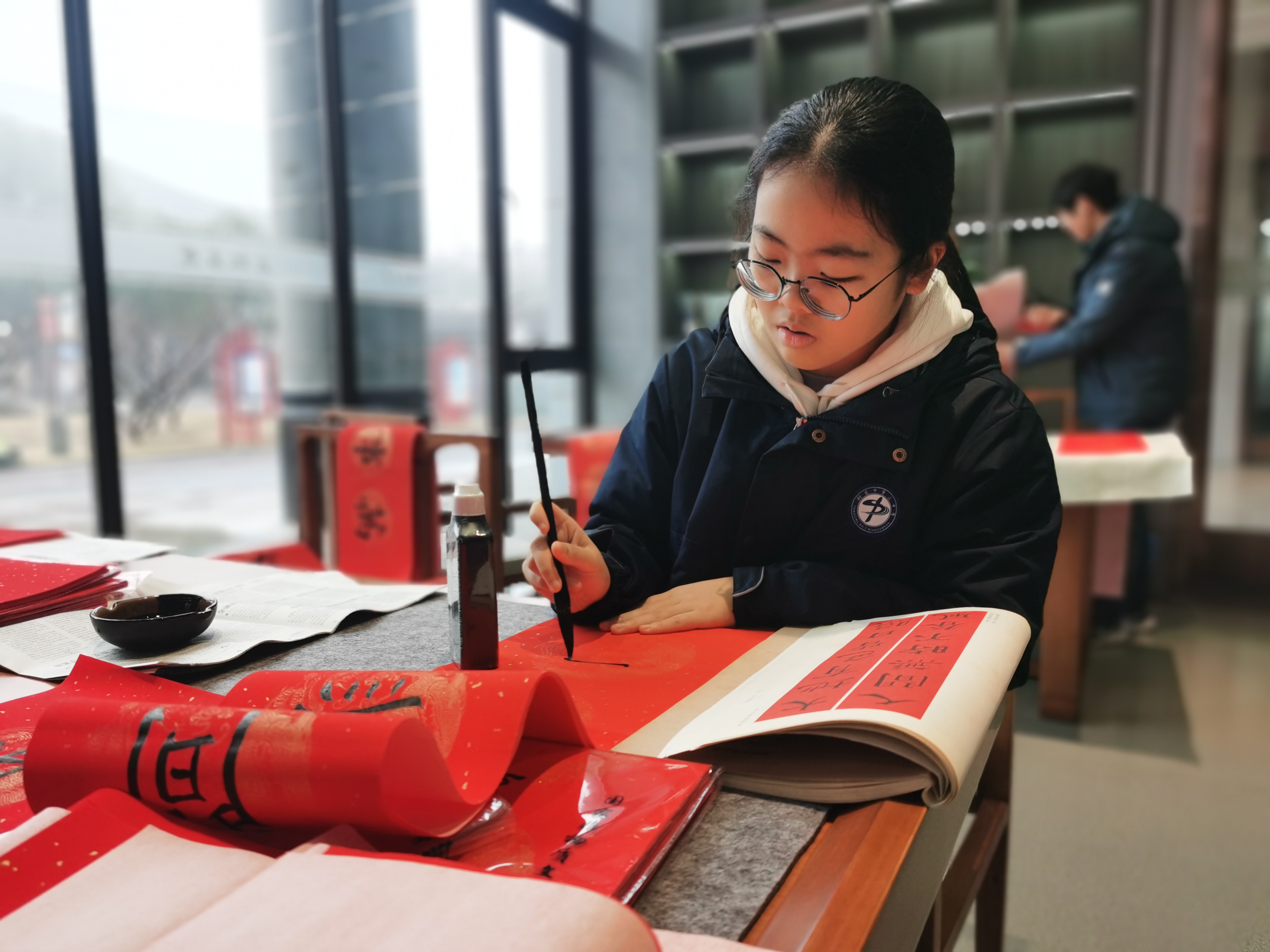 在五松书院一楼大厅,我校王勇、倪晋军等老师挥毫泼墨,我校邢梦涵(102班)、林毅然(102班)、张鹏飞(102班)、姚书宇(112班)以及淮河路小学饶毓(504班)等同学也牛刀小试,一展风采。