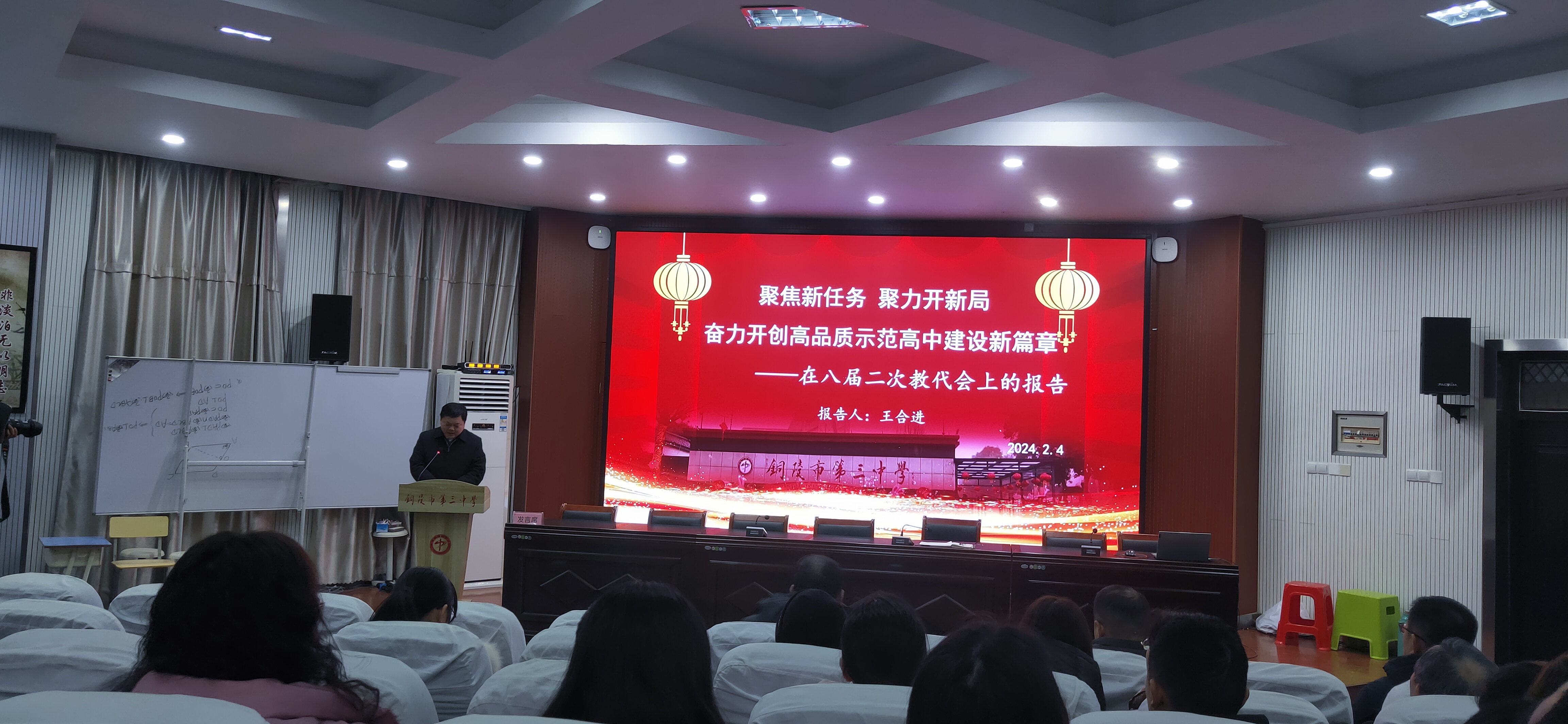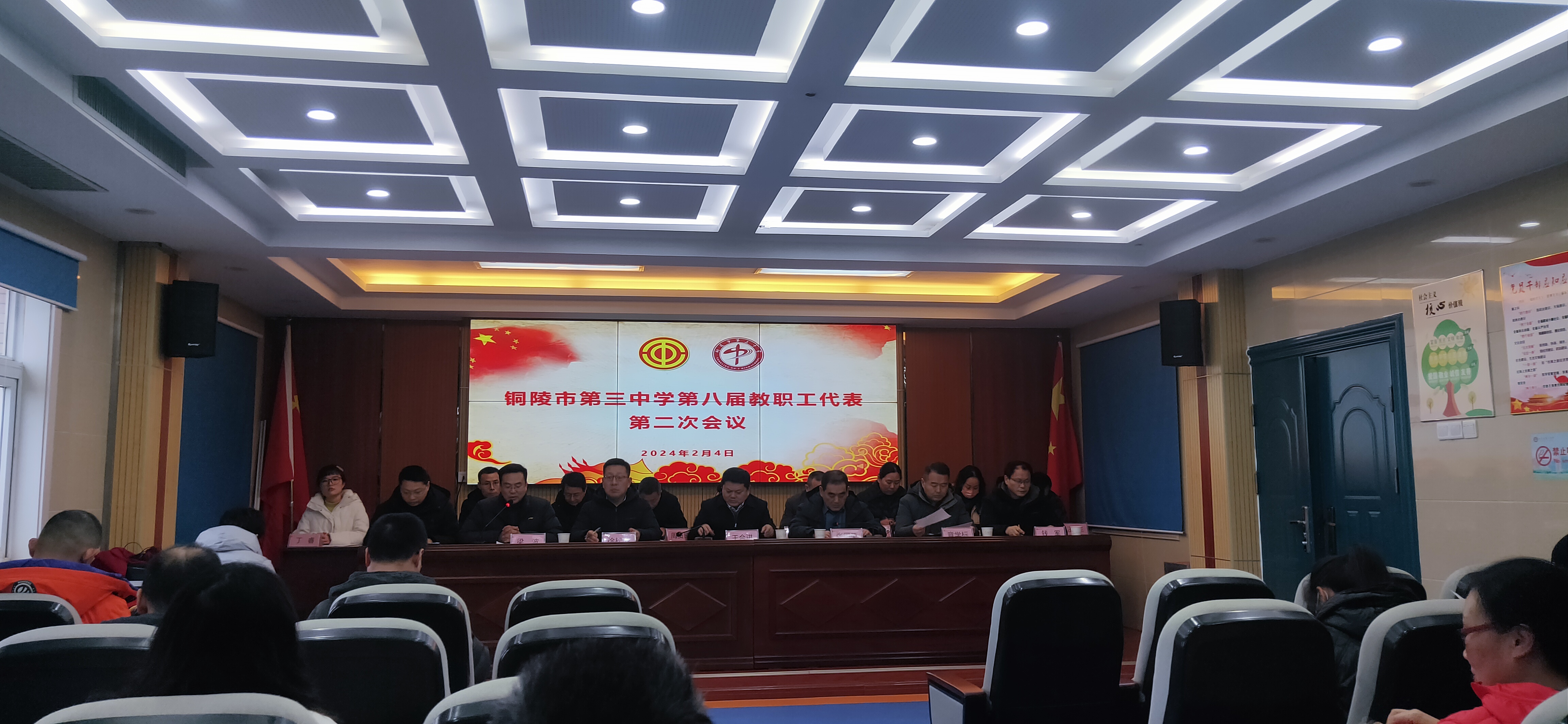 2024年2月4日上午,铜陵市第三中学八届二次教职工代表大会在躬行楼五楼多媒体会议室召开,校党委副书记、副校长王合进,校党委副书记张国荣,校党委委员、副校长徐松成,校党委委员、副校长章学标等出席大会并在主席台前排就坐。校教代会代表和列席代表共计81参加了大会,会议讨论并审议通过了《铜陵三中2023年学校工作报告》和《铜陵三中教师梯队建设实施方案》,校工会主席梁波主持会议。