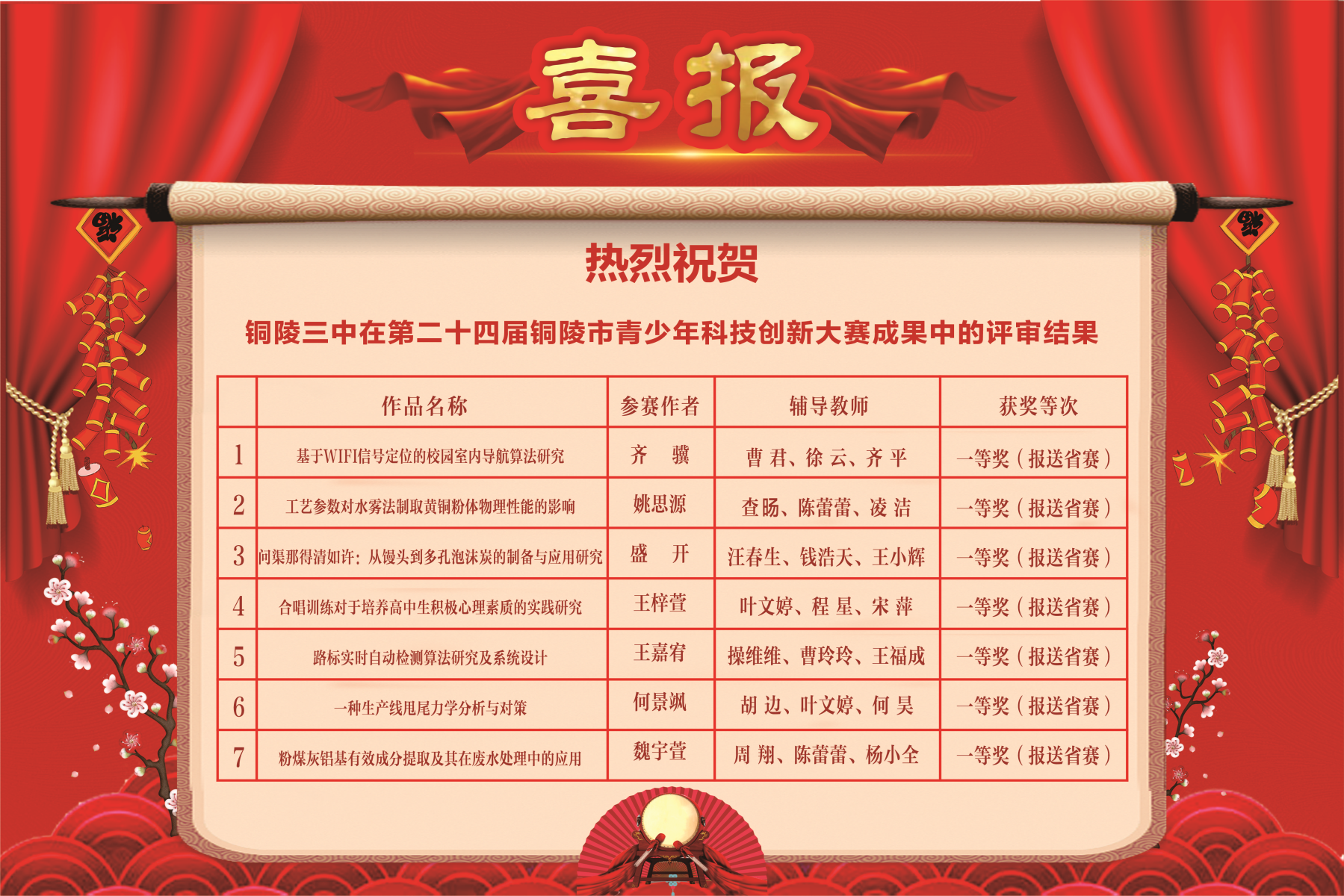 2024年2月21日,第24届铜陵市青少年科技创新大赛结果揭晓,我校师生取得亮眼成绩,共有七位同学在大赛中获得一等奖并继续申报安徽省青少年科技创新大赛。
