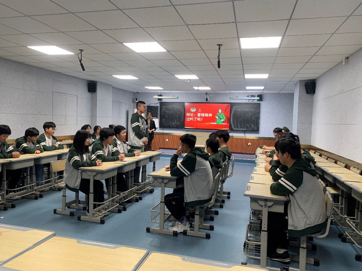 开展“雷锋精神是否过时?”辩论赛,赋予雷锋精神新含义,启发大家寻找“身边的雷锋”,从校外的医生、警察,到校内的老师、自管会成员、课代表等,都是雷锋精神的体现,最后