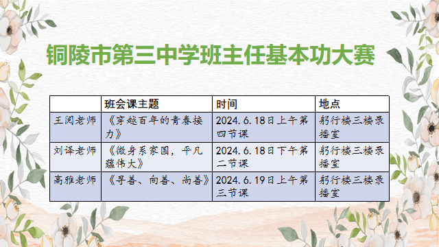 本次比赛以“拨动学生心弦的艺术”为主题,分为“育人故事”和“主题班会”两部分,按照自主报名,级部选拔的方式,共推荐刘译,王阅,高雅三位班主任参加校级比赛。故事方略 展现育人智慧