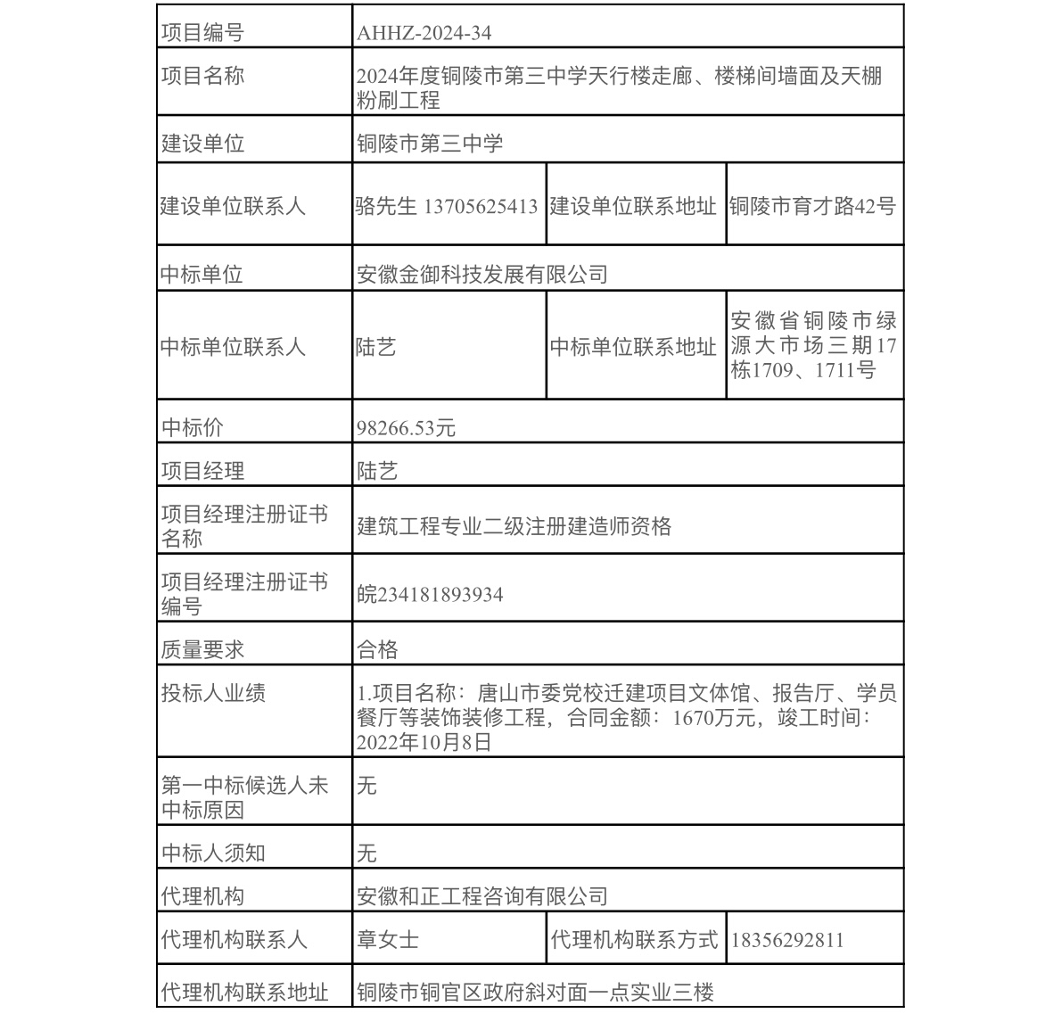 2024年度铜陵市第三中学天行楼走廊、楼梯间墙面及天棚粉刷工程中标结果公示