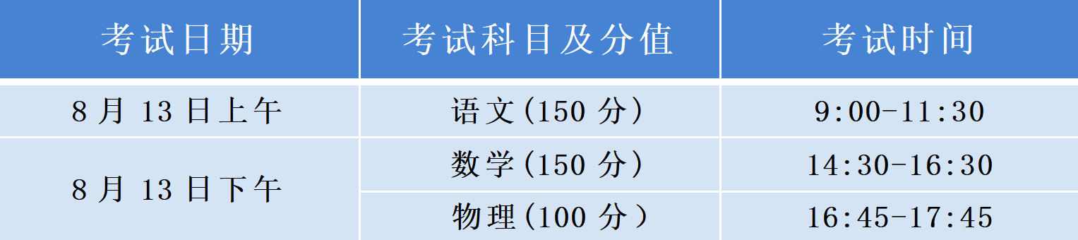 报考物理方向的考生考查语文、数学和物理三门学科;报考历史方向的考生考查语文、数学两门学科。