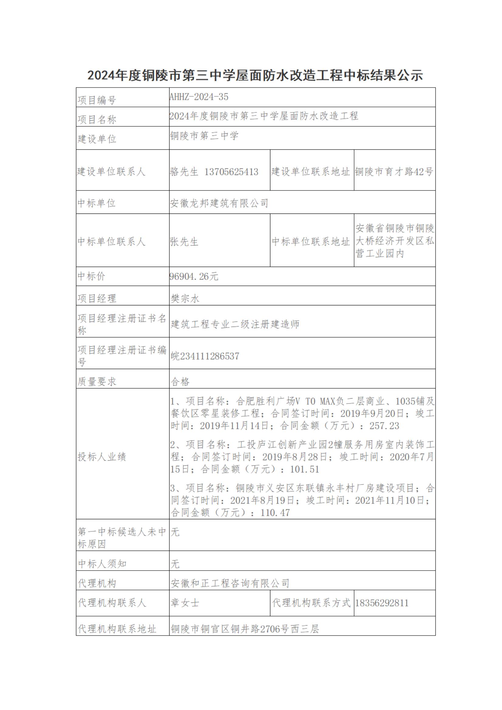 2024年度铜陵市第三中学屋面防水改造工程中标结果公示