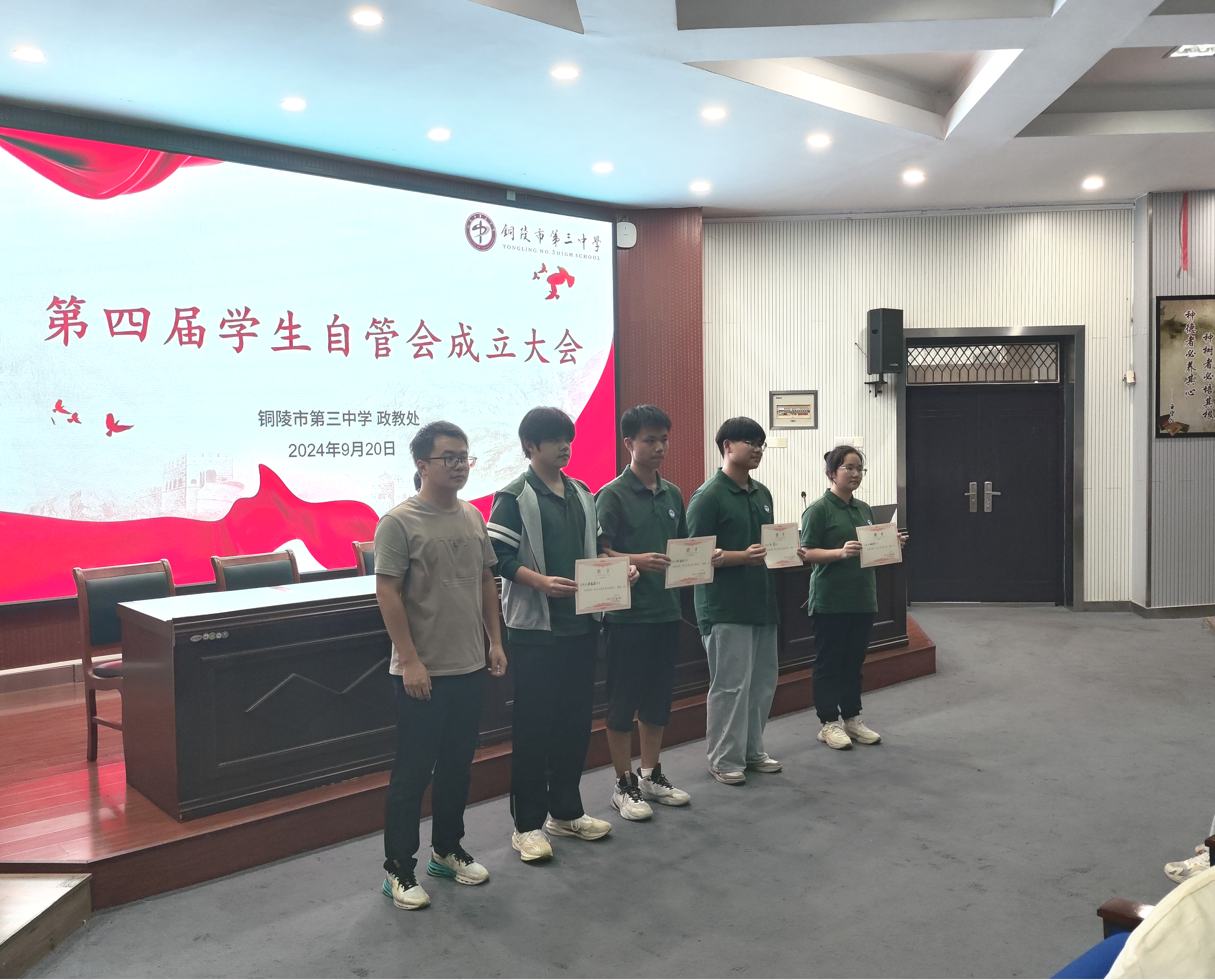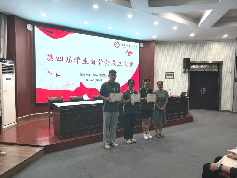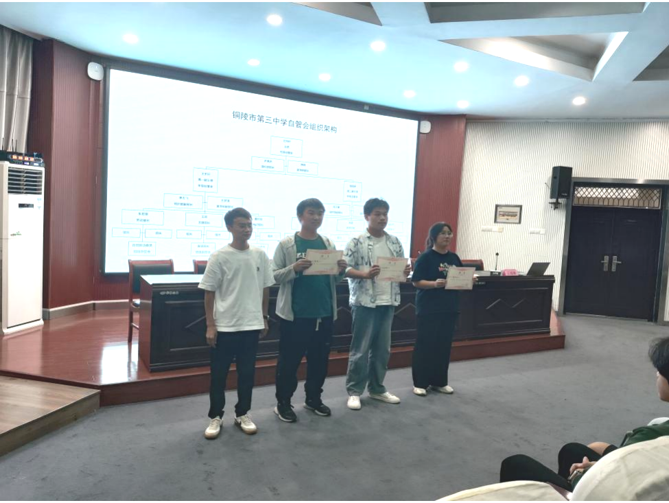 陈蕾蕾、汪军生、洪光耀分别给校级、高一、高二级部自管会学生干部颁发聘书。这不仅是对学生干部的认可和鼓励,更是一份沉甸甸的责任。