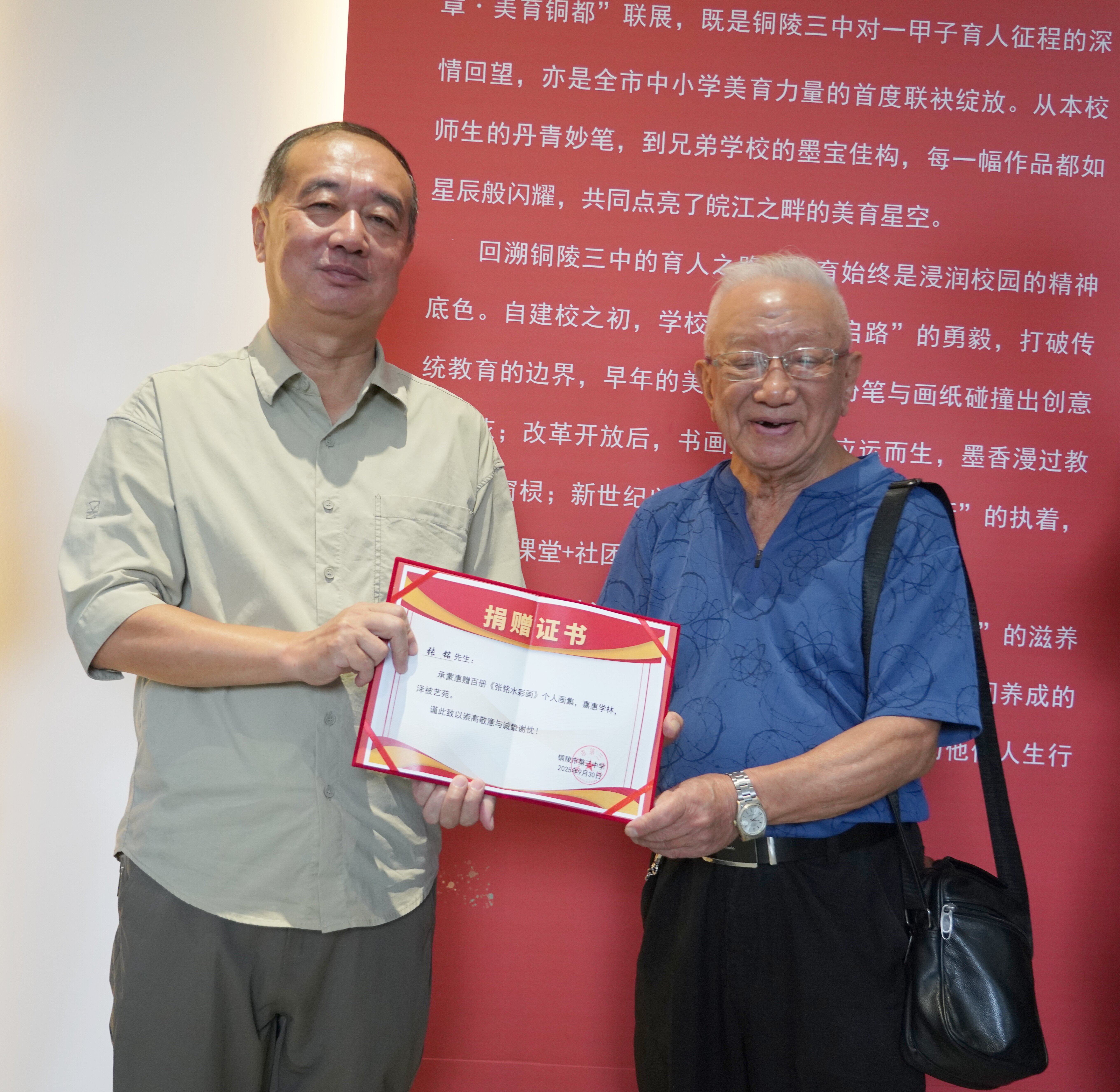 仪式现场还举行了两场富有意义的捐赠仪式。黄百新先生向我校捐赠个人书画艺术作品,笔墨间尽显对教育事业与美育传承的深切关怀;张铭先生则捐赠个人画册作品,以艺术成果反哺三中,为建校六十年活动增添文化厚度,现场掌声持续不断。