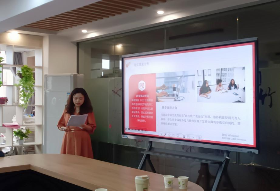 汇报由负责人古婷老师主讲,从研究背景、核心架构、预期成果、实施保障及可持续发展五个方面,系统阐述了本课题的设计思路与推进策略。古婷老师指出,课题积极响应新时代“五育并举”的育人导向,直面当前高中语文美育“碎片化”“表面化”的现实困境,致力于构建“课内深研—课外延展—社团活动—成果展示—智能支持”五位一体的浸润式美育模型,探索语文教学与审美教育深度融合的创新路径。