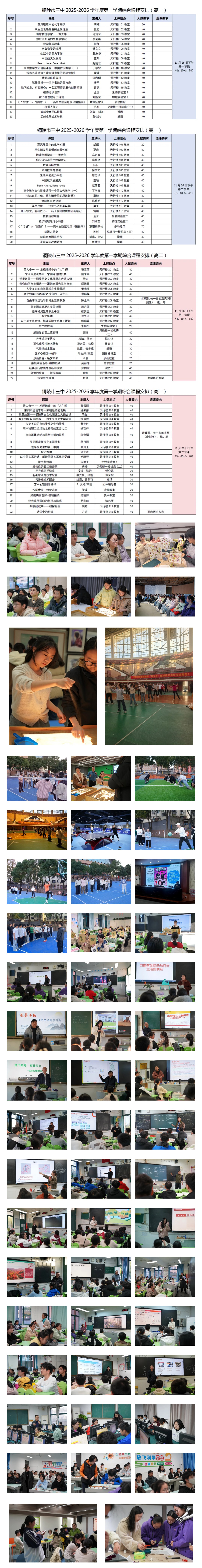 此次课程面向高一、高二年级全体学生,共计44位教师和3位学生家长积极报名,带来了一场场丰富多彩,启智润心、独具特色的综合课程项目,为学生的文化生活和个人成长注入了科技,历史,文化,运动,艺术等诸多活力。本次综合课程活动共计42门特色课程,课程分为第一、第二两个课时。课程采取学生自主线上选课,线下上课模式,大屏幕宣传展示课程安排及相关信息,高一高二年级全体学生踊跃报名。以下为本次综合课程活动安排: