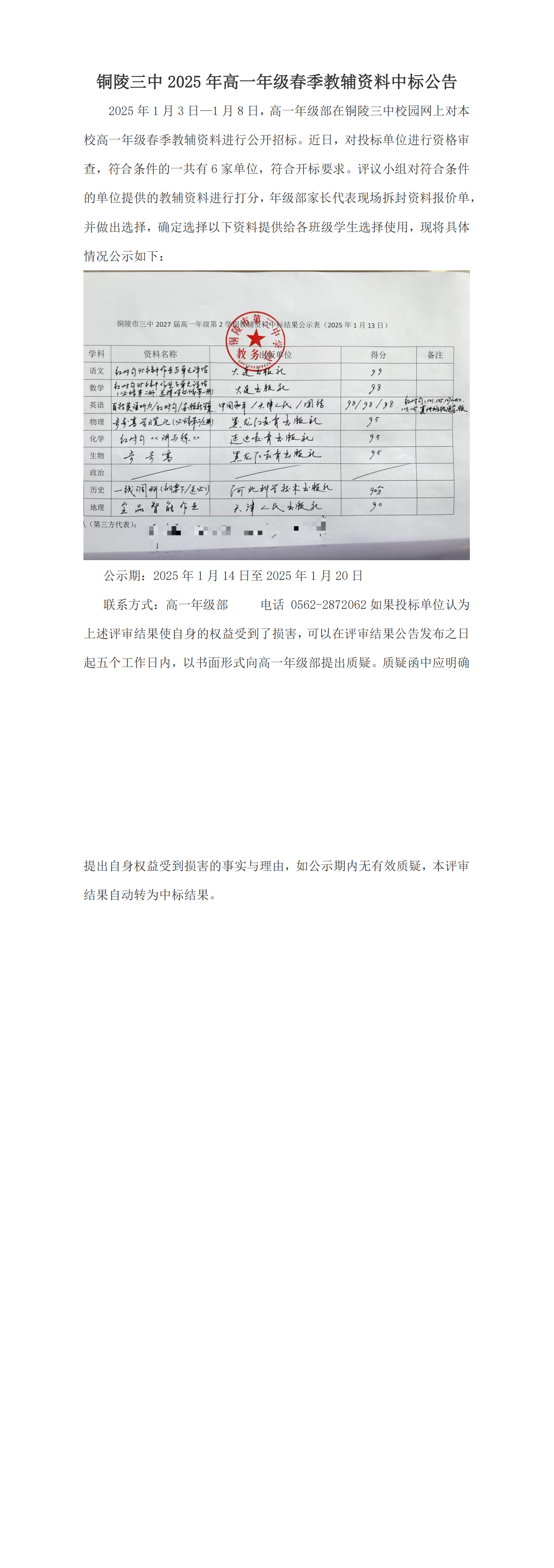 铜陵三中2025年高一年级春季教辅资料中标公告