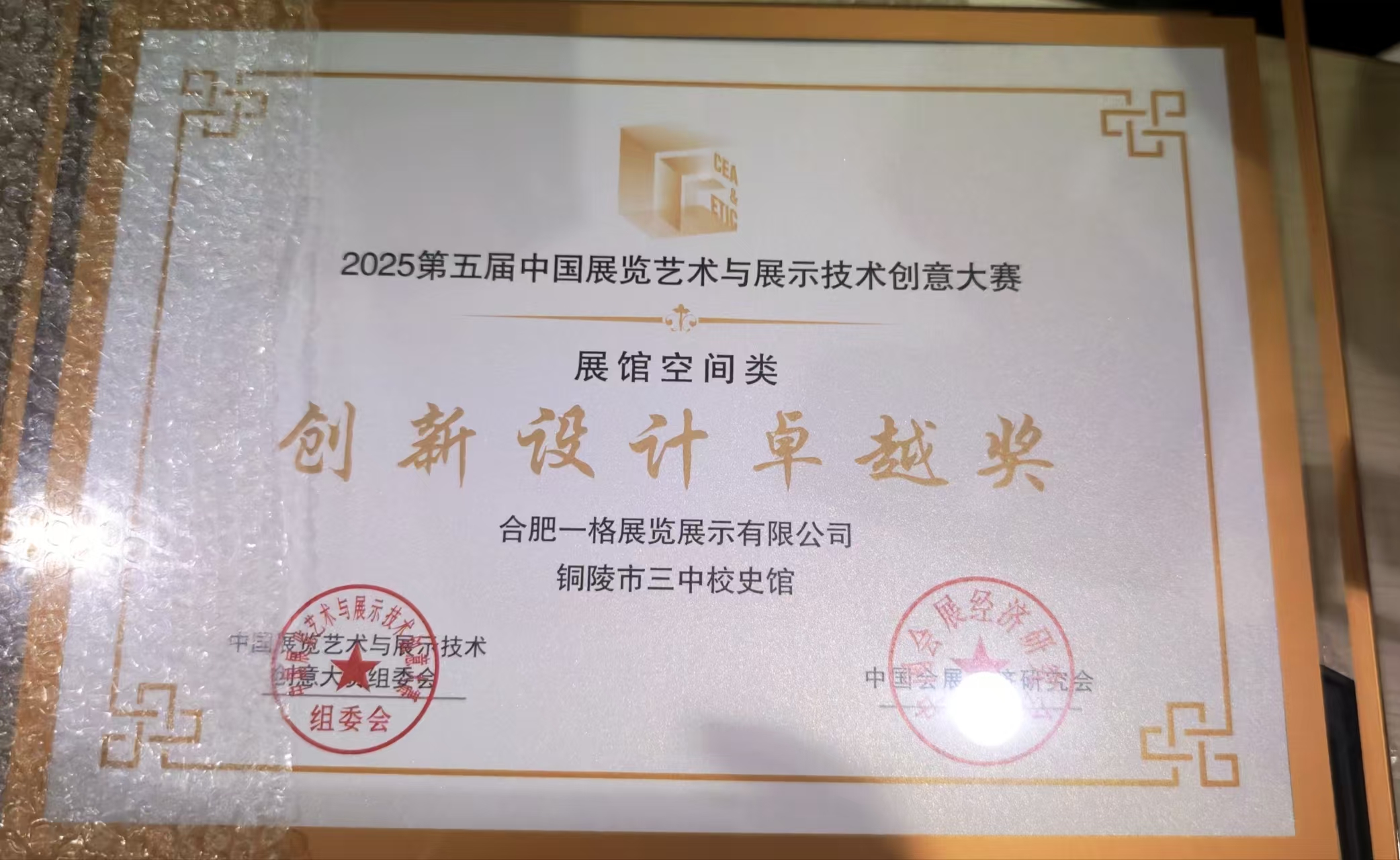 铜陵三中校史馆获2025第五届中国展览艺术与展示技术创意大赛展馆空间类创新设计卓越奖。