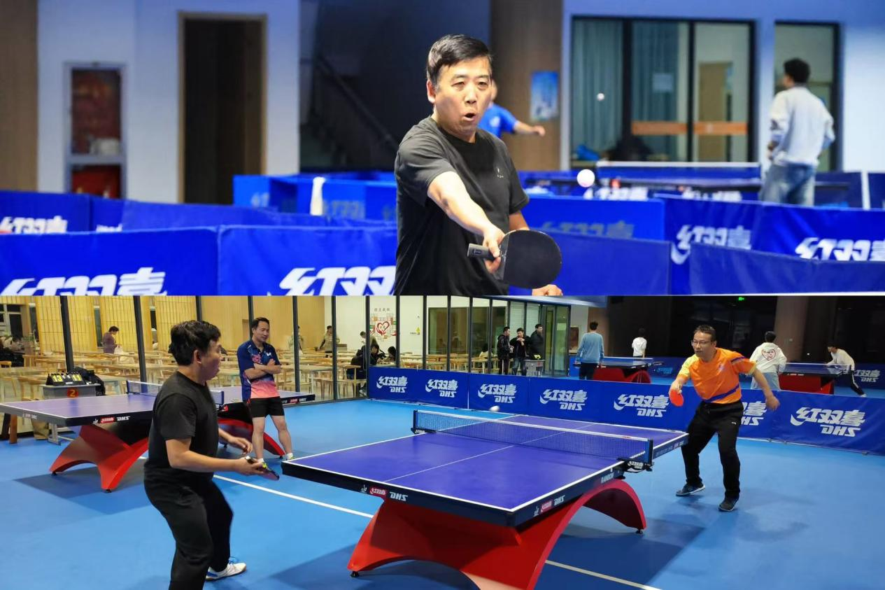 (配图说明:赛场精彩瞬间——老师们全神贯注、身姿矫健,乒乓球在空中划出一道道活力弧线。)