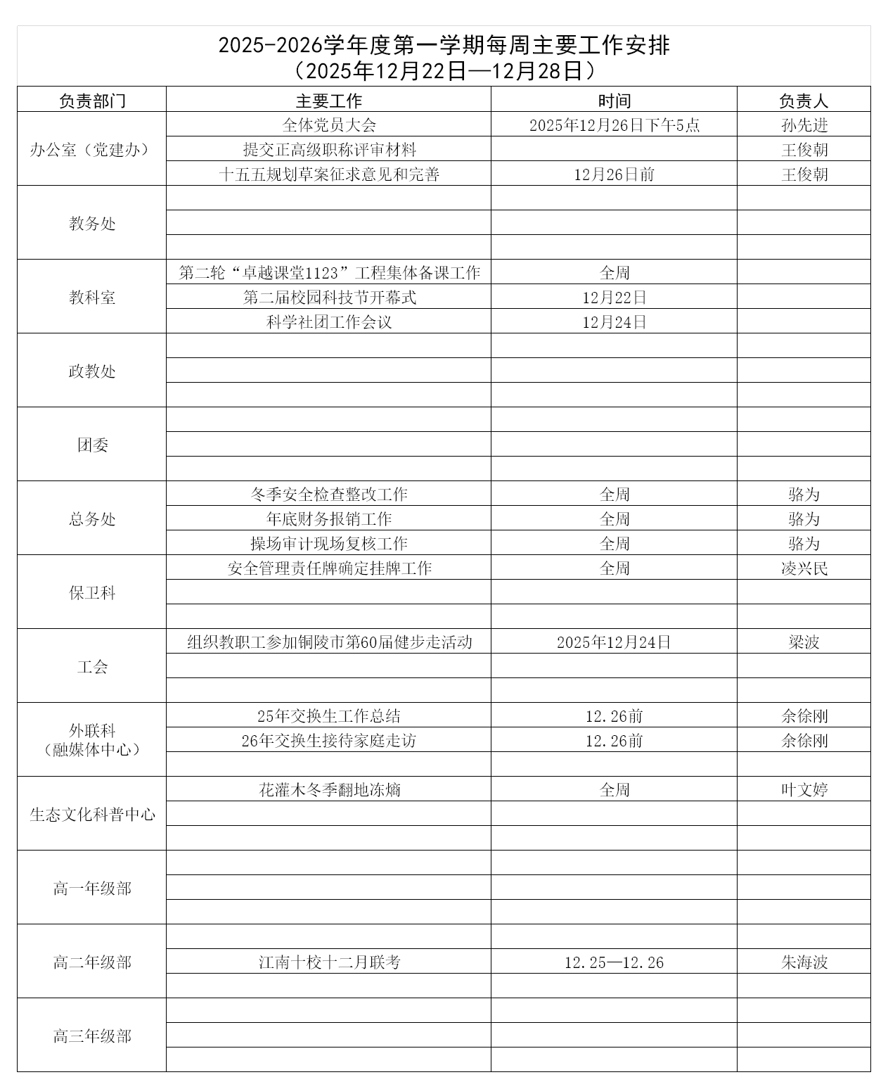铜陵三中2025年秋季学期周工作安排(2025年12月22日-12月28日)