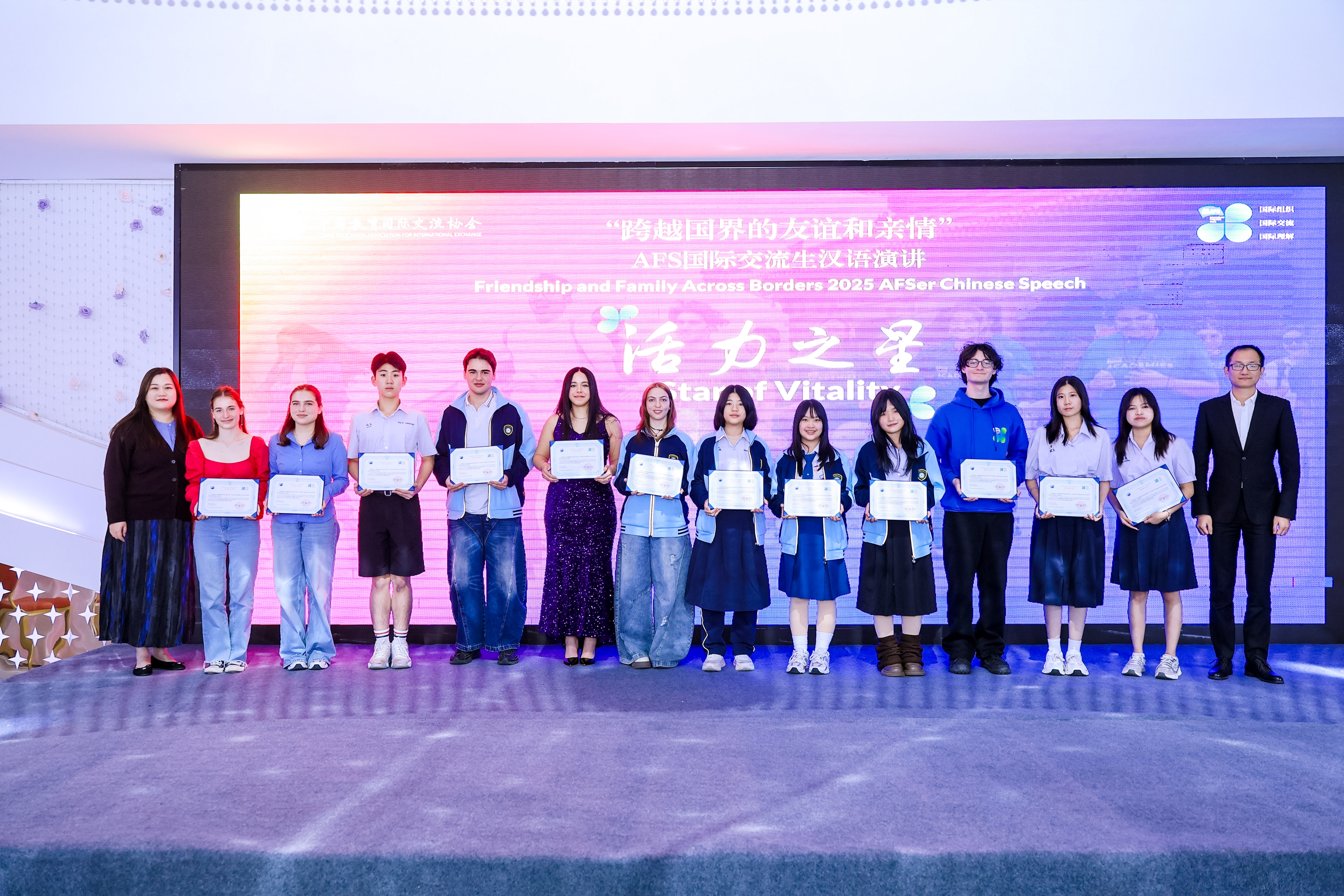 目前就读于我校的AFS项目巴西交换生Yumi同学,在大会举办的“跨越国界的友谊和亲情”主题演讲比赛中,以真挚的情感和流畅的表达荣获三等奖。我校另外两位交换生获得“活力之星”称号。此外,Yumi同学还担任“国际之夜:世界文化博览”活动主持人。他们的精彩表现是我校国际化育人成果的生动缩影。