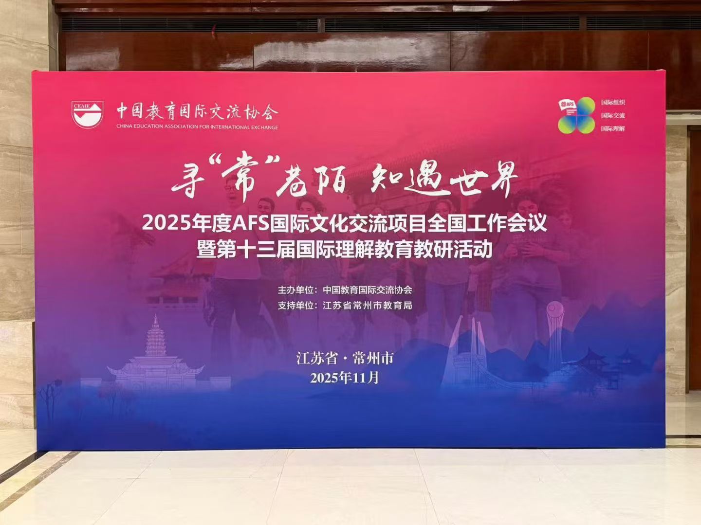11月27日至29日,2025年AFS国际文化交流全国工作会议暨第十三届国际理解教育教研活动在江苏省常州市成功举办。本次会议汇聚了来自全国各地的国际教育专家、学者、项目学校代表及一线教师。为期三天的会议采取主旨报告、圆桌对话、实地调研等形式,旨在共享国际理解教育的创新实践,共同探索新时代教育对外开放的高质量发展路径。我校外联科干事朱少伟老师作为学校代表参会。