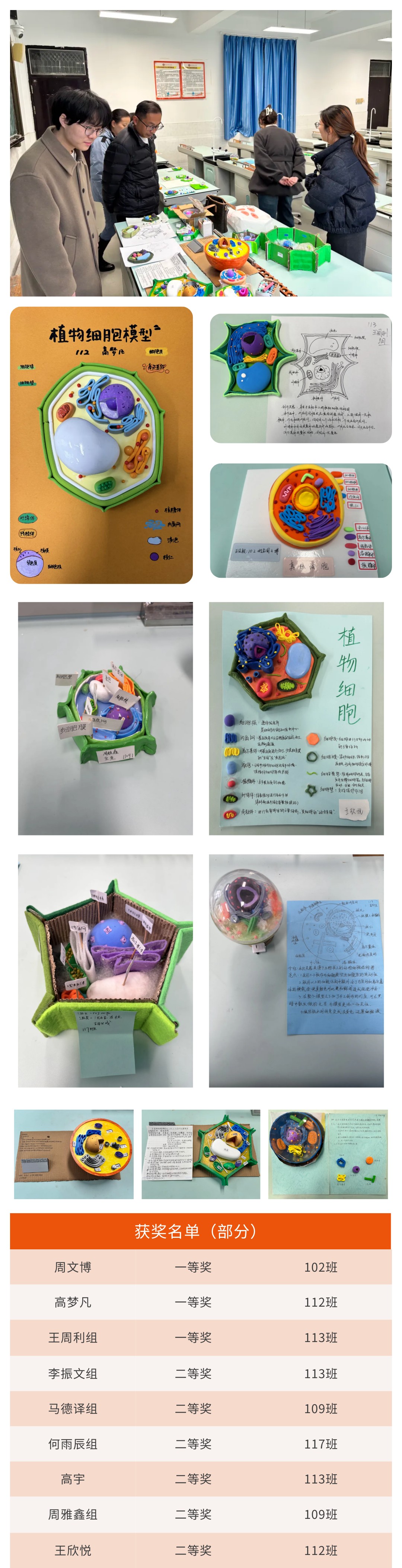经过生物学科组教师从科学性、创新性、美观性及制作精细度等方面的综合评审,最终评选出一等奖3名、二等奖6名、三等奖若干。获奖作品设计新颖、构思巧妙,准确呈现了细胞膜、细胞核、线粒体、叶绿体等关键结构。
