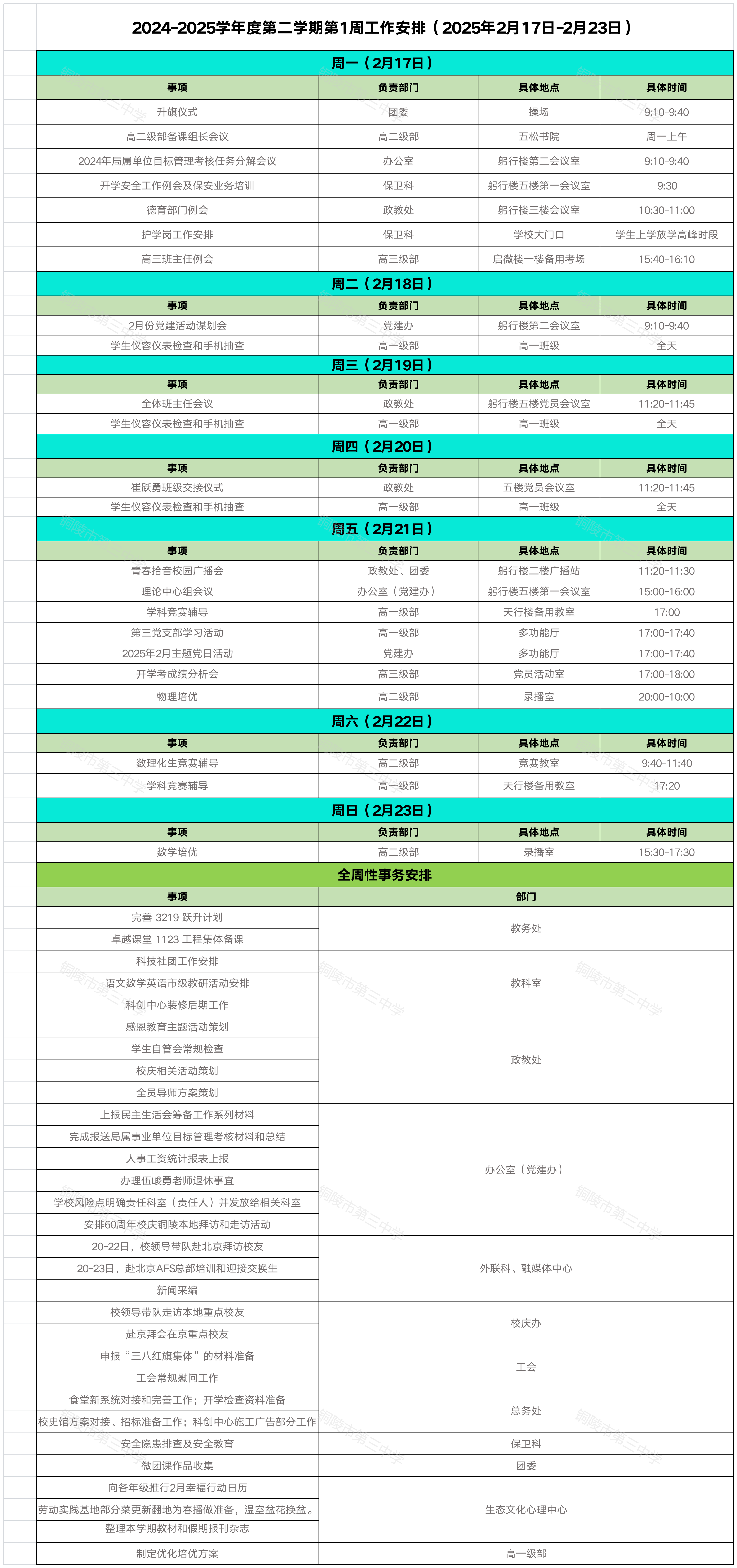 铜陵三中2025年春季学期周工作安排(2025年2月17日-2月23日)