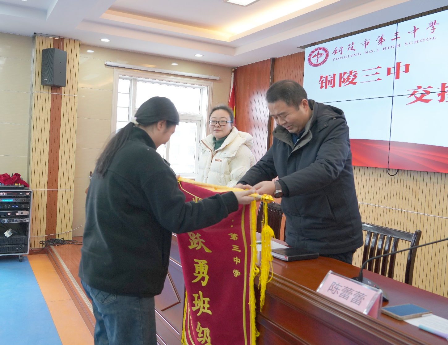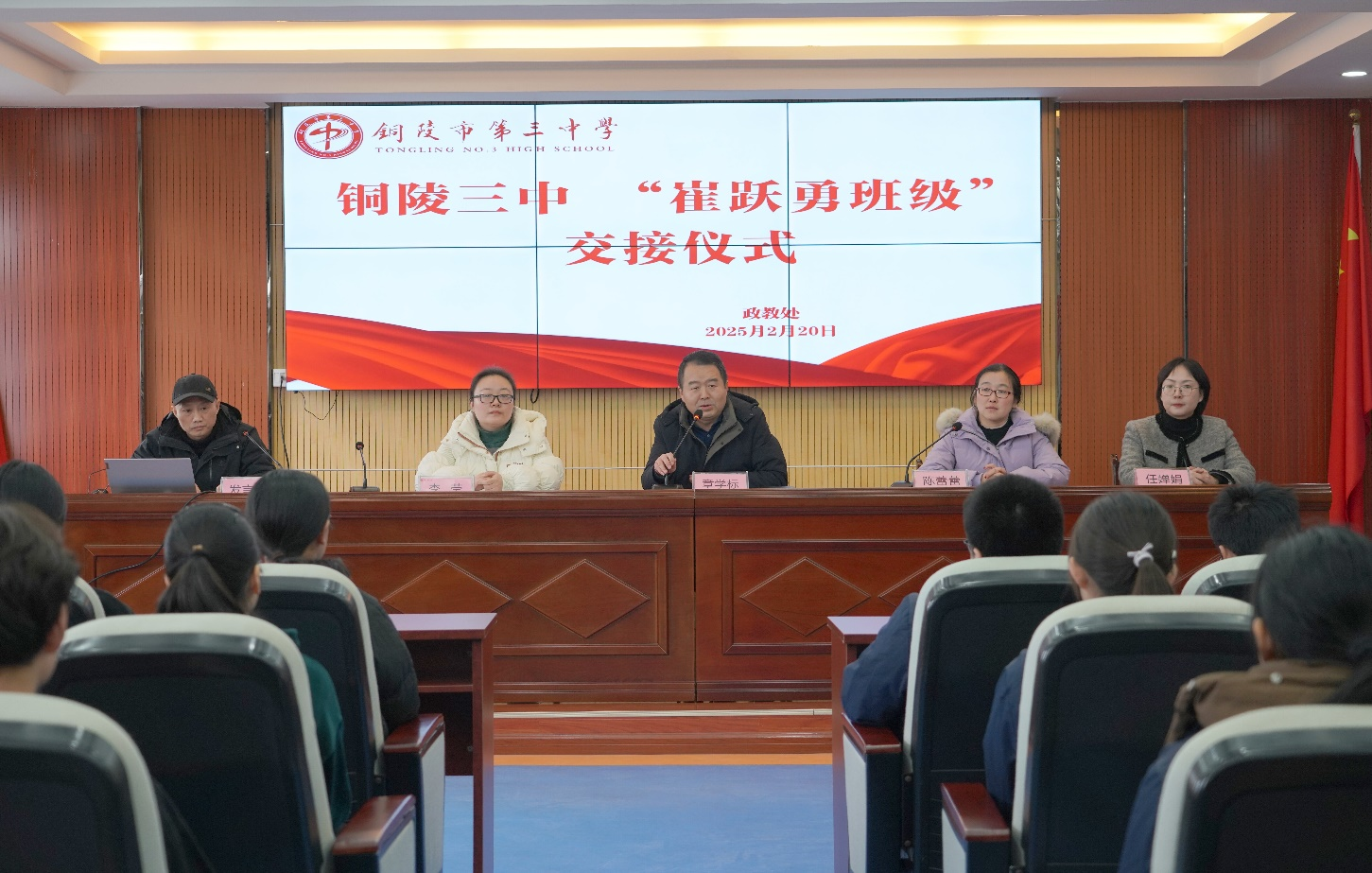 为传承英烈精神,激励莘莘学子勇担时代使命。2025年2月20日上午,铜陵市第三中学在躬行楼五楼党员会议室隆重举行“传承英雄志 接力向未来”主题的“崔跃勇班级”交接仪式。校党委委员、副校长章学标,政教处副主任陈蕾蕾,311班和109班全体同学及班主任齐聚,共同见证赓续英雄精神血脉的庄严时刻。