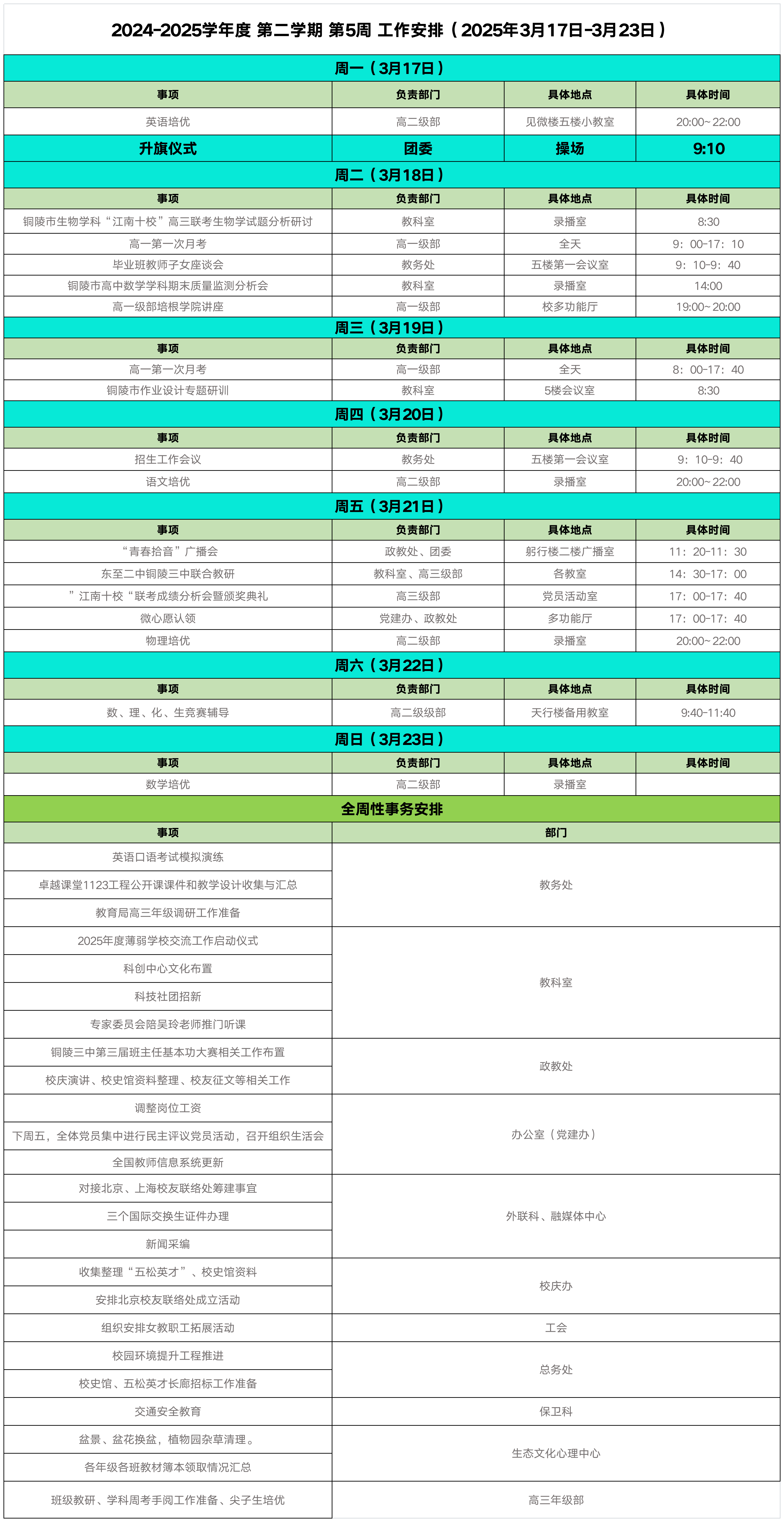 铜陵三中2025年春季学期周工作安排(2025年3月17日-3月23日)