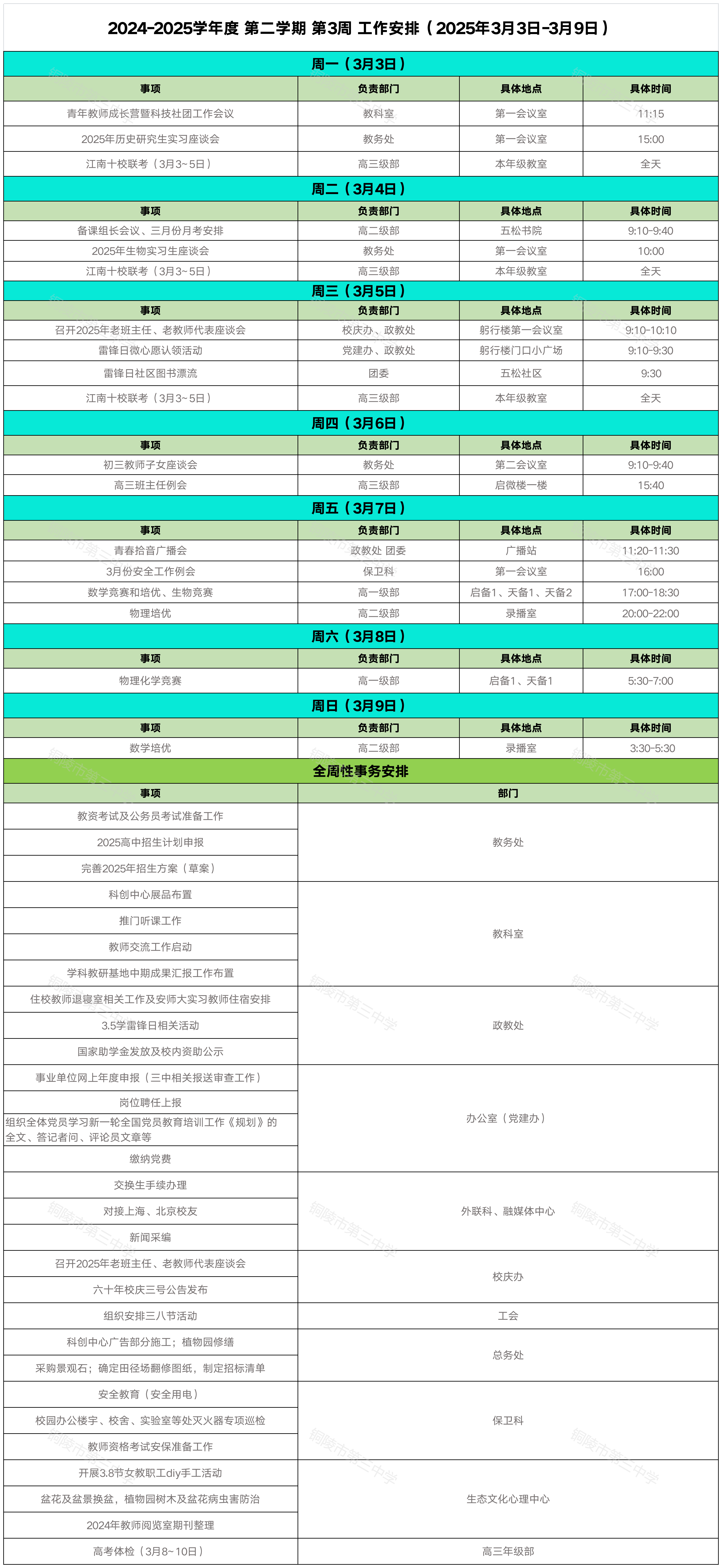 铜陵三中2025年春季学期周工作安排(2025年3月3日-3月9日)