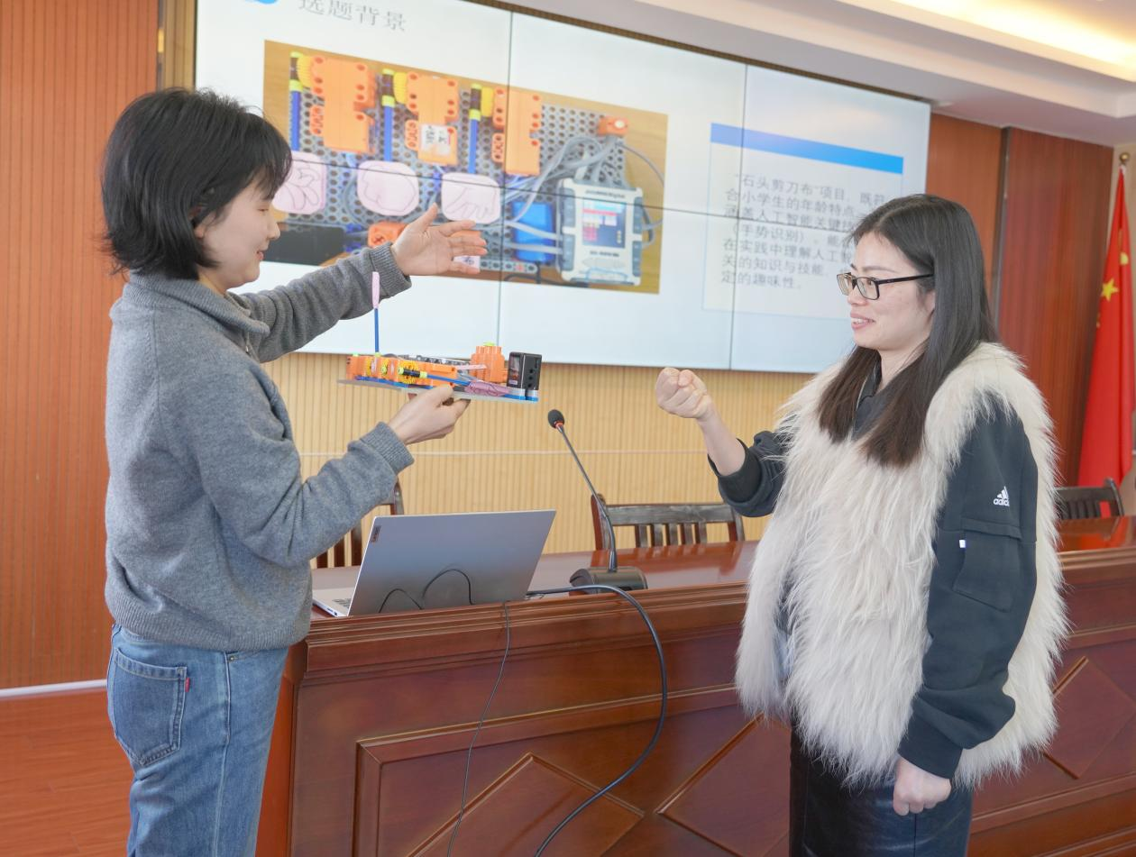 来自北京路小学的彭仕春老师展示了《锤子、剪刀、布》案例。她以趣味游戏为引导,让学生借助摄像头识别手势并与机器互动,在“猜测原理—实践体验—优化分析”的过程中,深刻领会图像分类的基本原理。