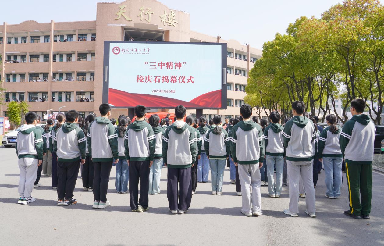 局领导、校领导与校友共同为校庆石揭幕。这块校庆石石上面镌刻着 “开山启路,百炼争新”(著名书法家、林散之入室弟子冯仲华先生书写) 的三中精神,此后,它将成为校园里一道亮丽的风景线。