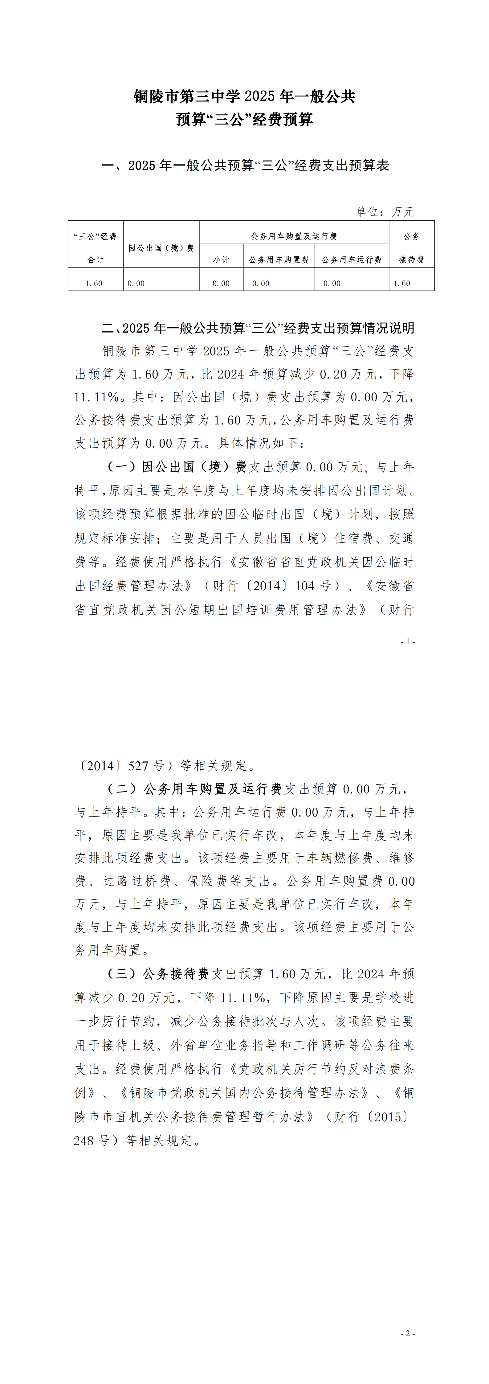 铜陵市第三中学 2025 年一般公共预算“三公”经费预算