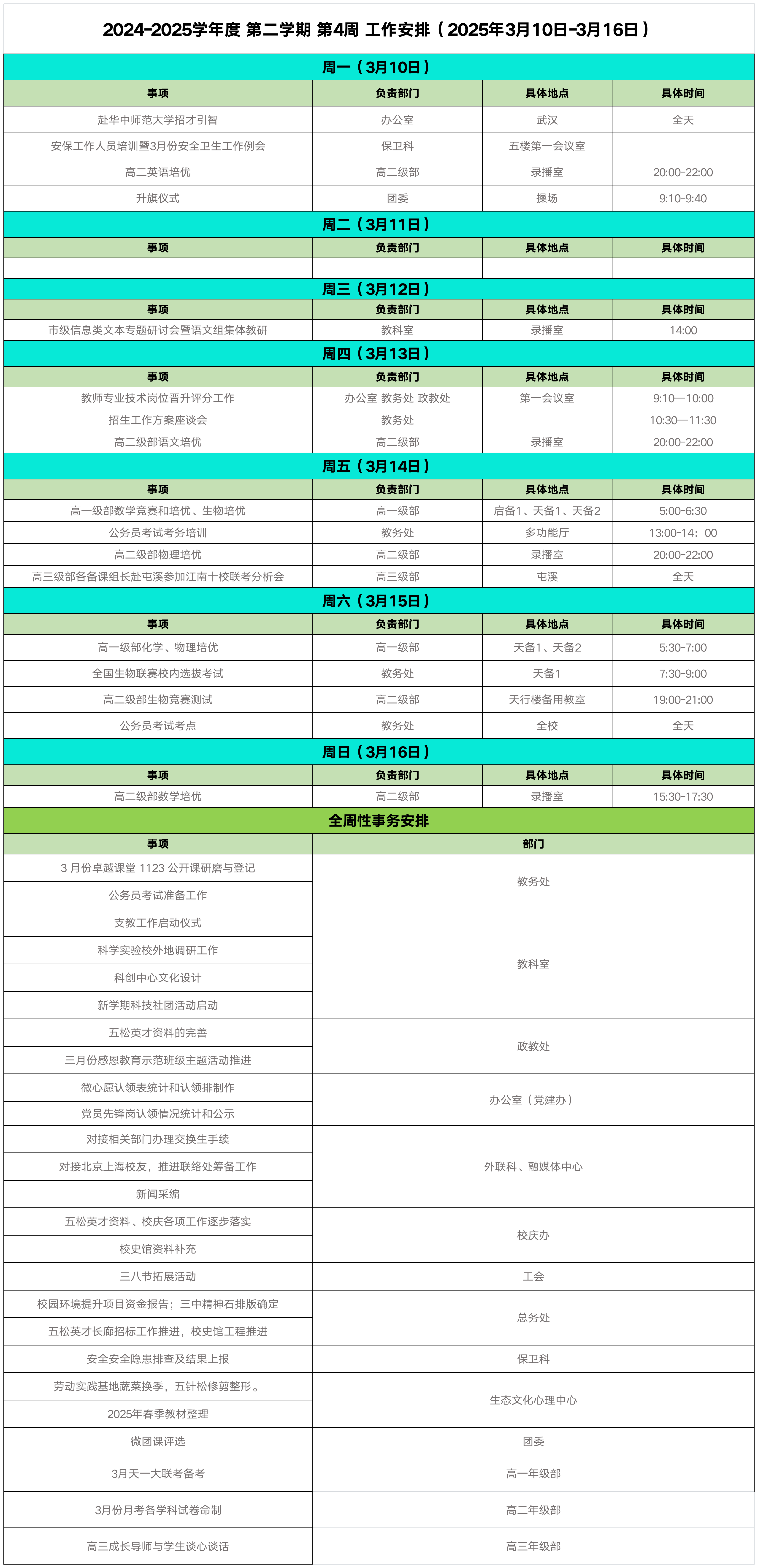 铜陵三中2025年春季学期周工作安排(2025年3月10日-3月16日)