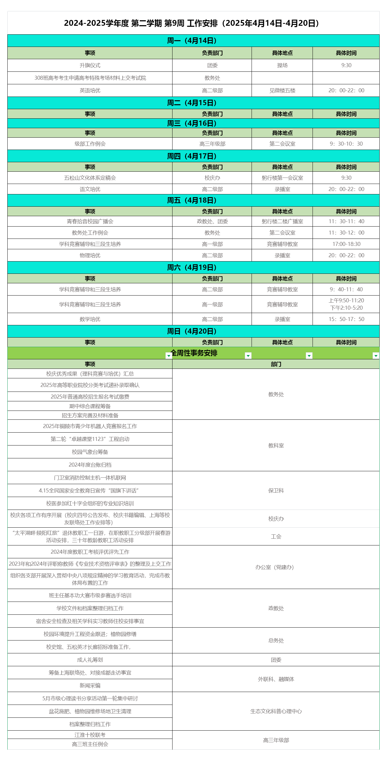 铜陵三中2025年春季学期周工作安排(2025年4月14日-4月20日)