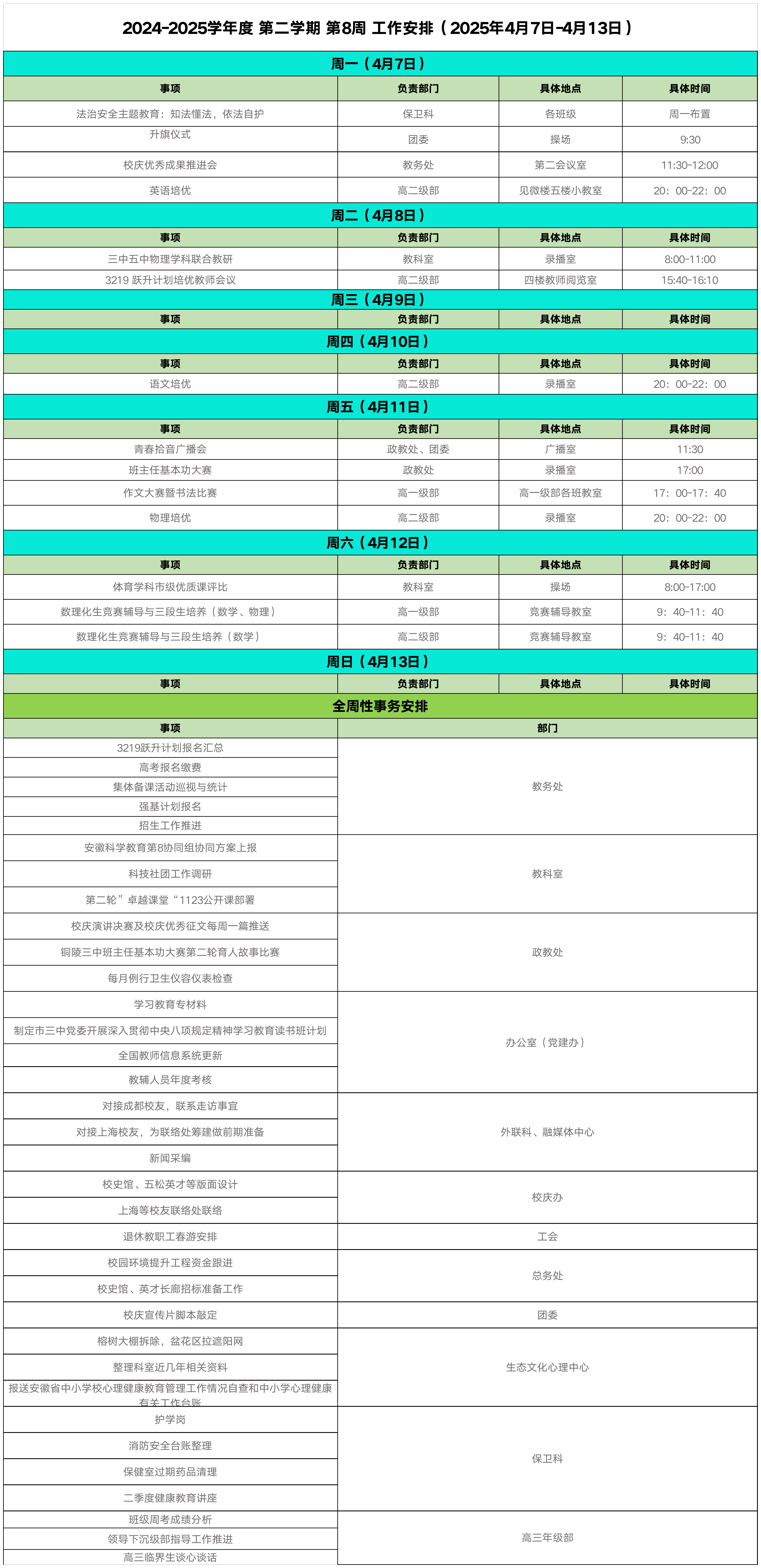 铜陵三中2025年春季学期周工作安排(2025年4月7日-4月13日)
