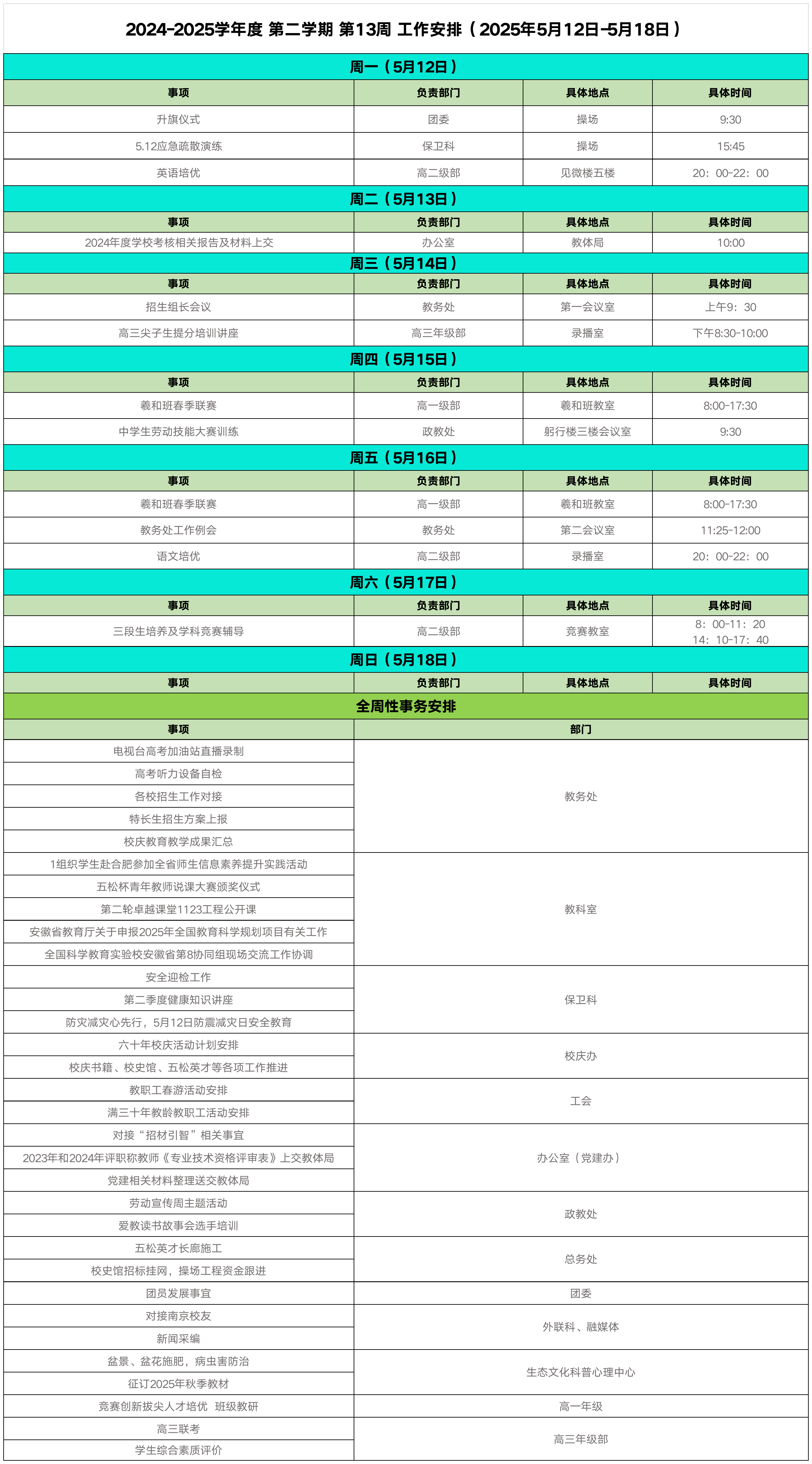 铜陵三中2025年春季学期周工作安排(2025年5月12日-5月18日)