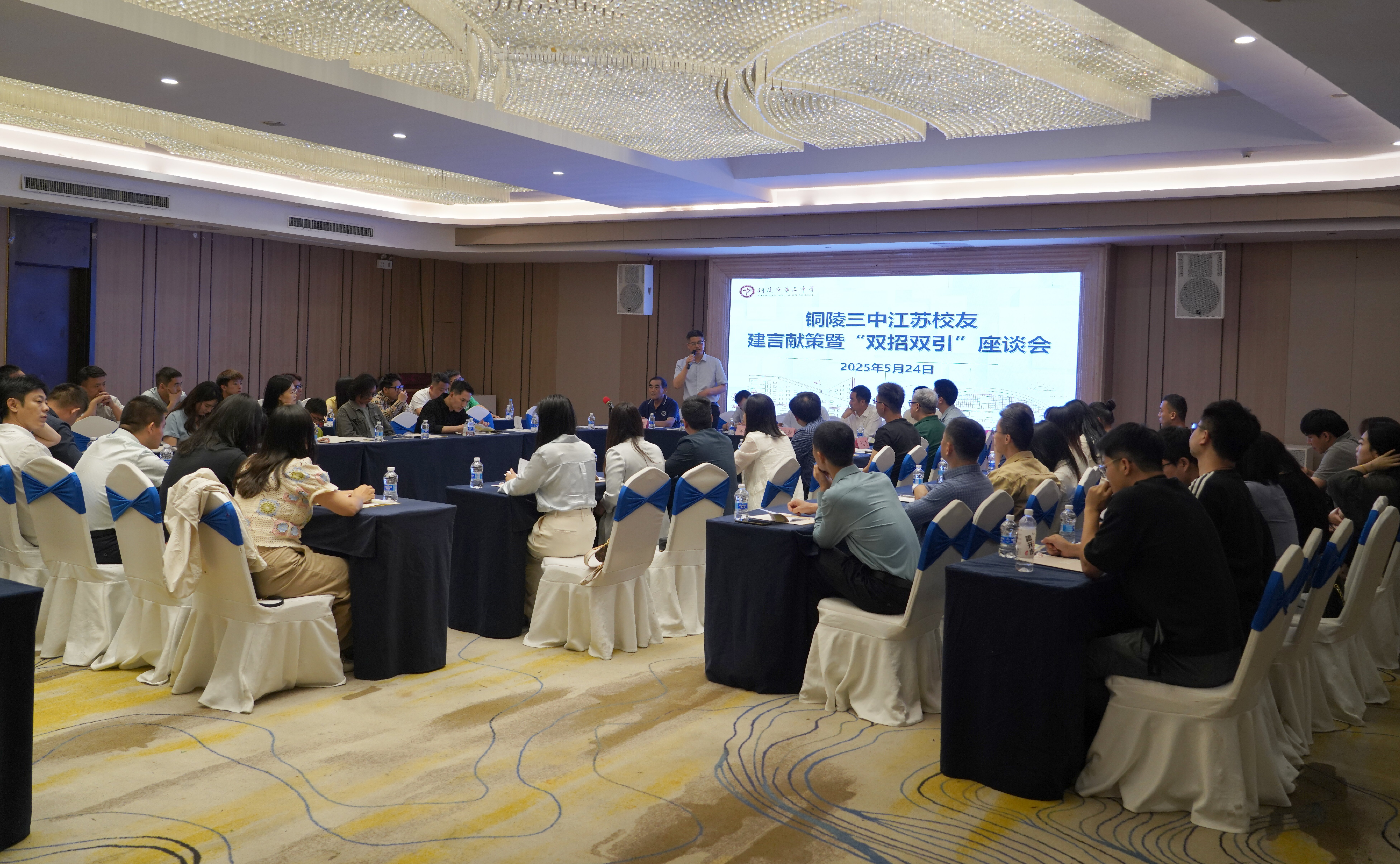 值铜陵市第三中学建校60周年之际,为进一步增进学校与校友的紧密联系,凝聚校友力量,集聚优质校友资源与铜陵产业发展深度融合、协同共进,助力铜陵经济高质量发展,5月24日下午,我校在在南京召开江苏校友建言献策暨“双招双引”座谈会。铜陵市招商服务中心党组书记、主任洪建国,市教体局党委委员、副局长高业权,南京铜陵商会会长纪良国,校党委副书记、校长张尤俊,校委副书记张国荣,党委委员、工会主席梁波等出席会议,在江苏工作的近70余位校友代表参加了座谈会。会议由外联科负责人余徐刚主持。