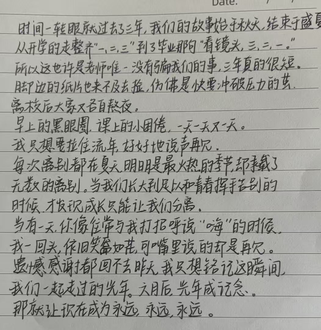 在这个蝉鸣渐起的毕业季,高三的教室里满是离别的氛围。不同于以往毕业时的喧嚣与热闹,同学们纷纷伏案,执笔书写,将平时难以开口表达的话语化作笔下的文字,用最传统却最深情的方式—书写信件,向老师、父母和同窗传递心中的感恩与不舍,让一封封书信承载着青春的记忆与真挚的情感。