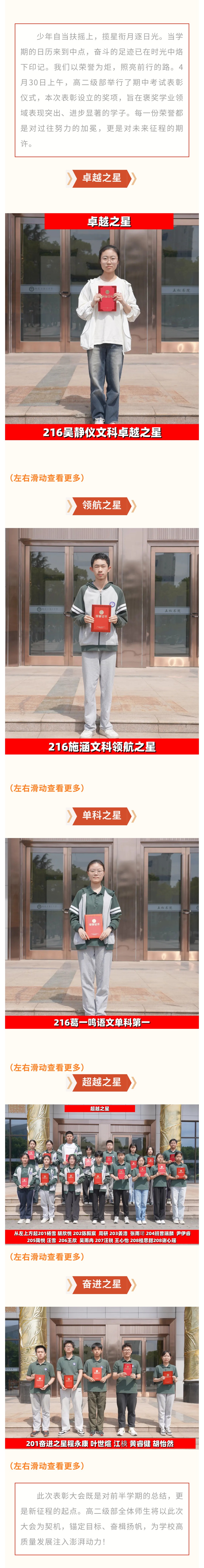 少年自当扶摇上,揽星衔月逐日光。当学期的日历来到中点,奋斗的足迹已在时光中烙下印记。我们以荣誉为炬,照亮前行的路。4月30日上午,高二级部举行了期中考试表彰仪式,本次表彰设立的奖项,旨在褒奖学业领域表现突出、进步显著的学子。每一份荣誉都是对过往努力的加冕,更是对未来征程的期许。