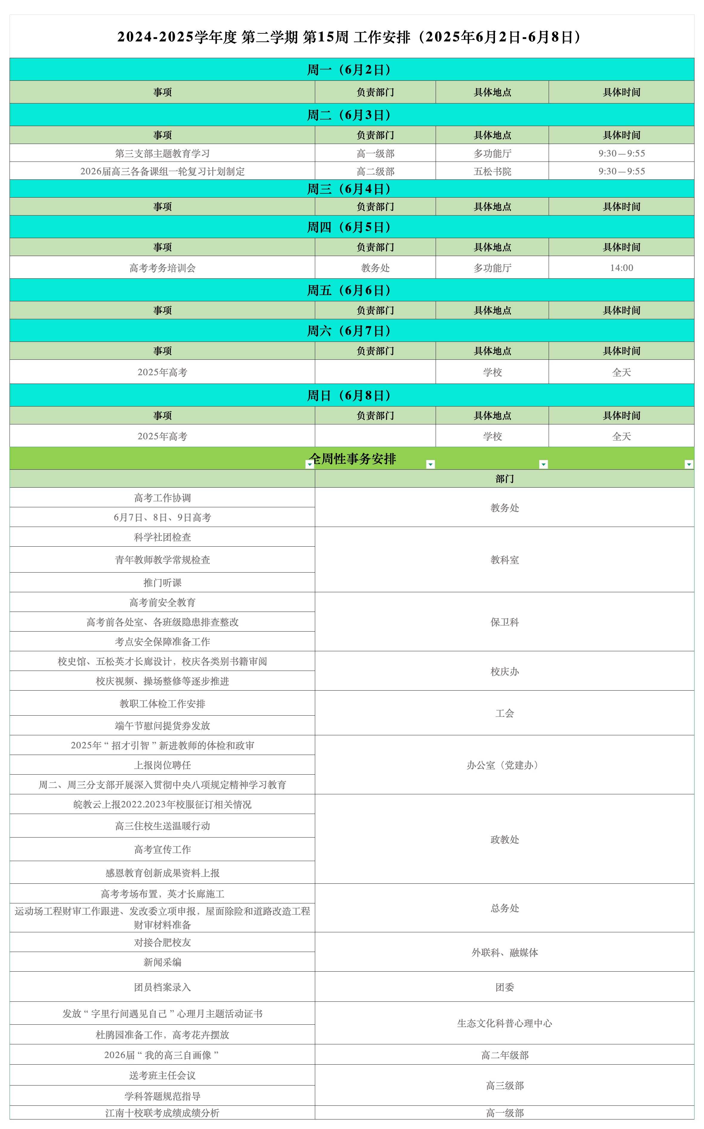 铜陵三中2025年春季学期周工作安排(2025年6月2日-6月7日)