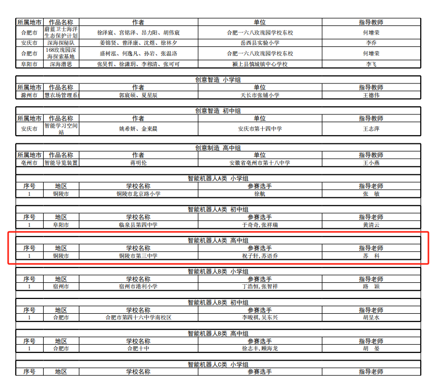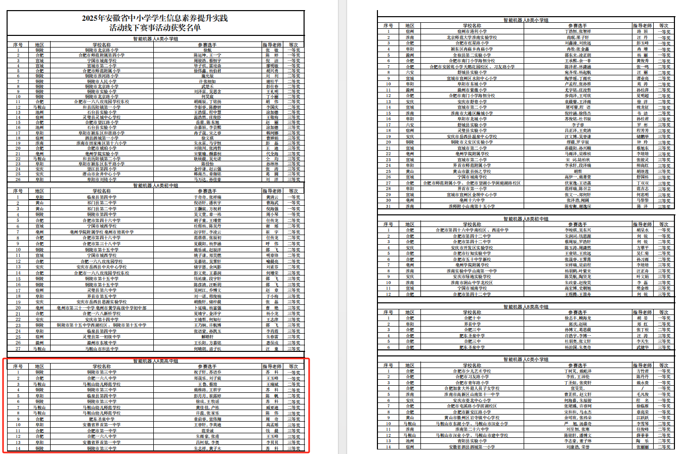 其中,祝子轩同学在A 类机器人项目中获得冠军,将代表安徽省参加全国学生信息素养交流活动。