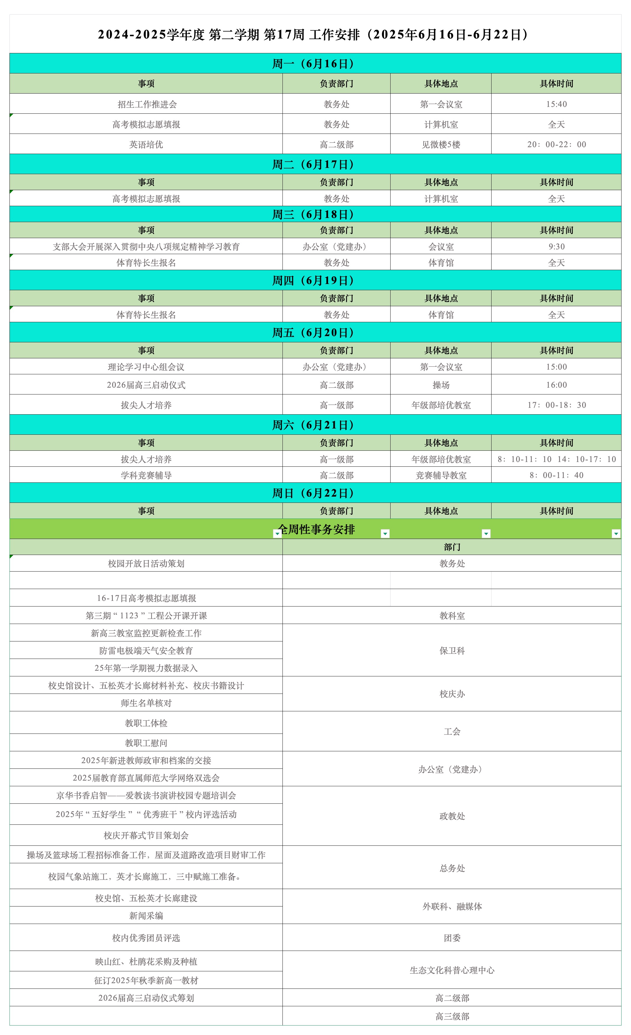 铜陵三中2025年春季学期周工作安排(2025年6月16日-6月21日)