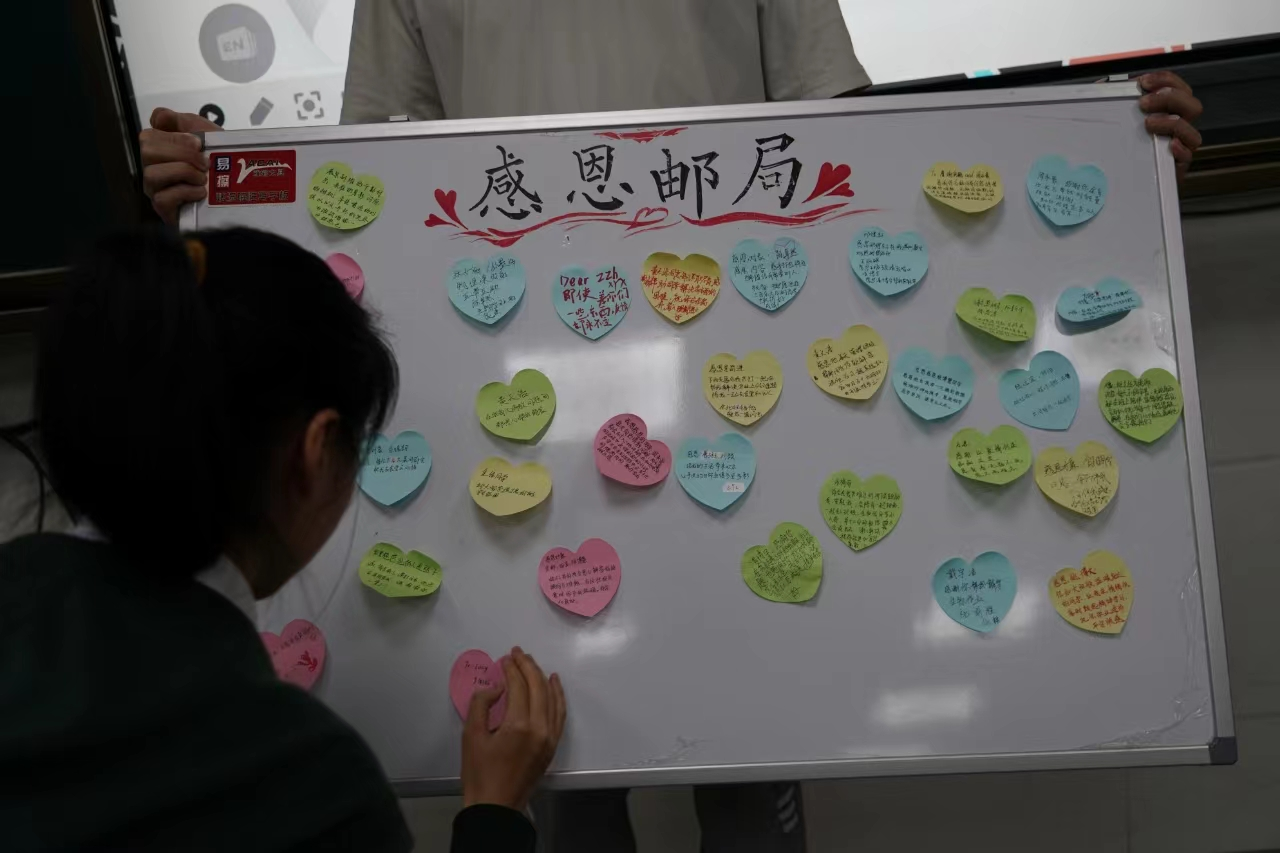 “感恩无需华丽仪式,一句‘谢谢’、一个微笑足矣。”在主持人引导下,同学们书写感恩便利贴,内容包括感恩对象,感恩事件,表达祝福。所有同学将便利贴贴于黑板旁“感恩邮局”,汇成彩色“心意墙”。随机抽取朗读时,被点名的同学面带羞涩,台下报以善意的笑声与掌声。“致朱旖菲:谢谢你在我难过的时候给我鼓励和安慰,陪我一起抽象...”“致陈卓然:谢谢你总是把好吃的分享给我...”“致周永豪:谢谢你总是不厌其烦地给我讲题...”