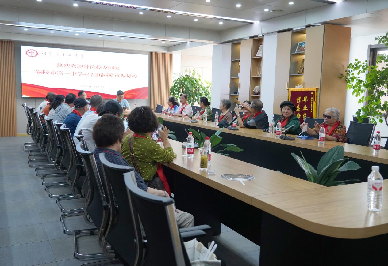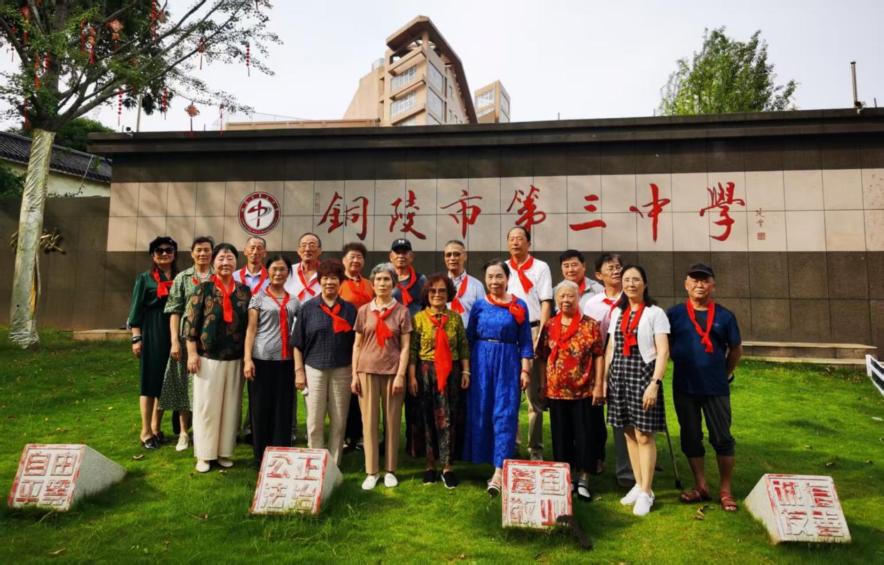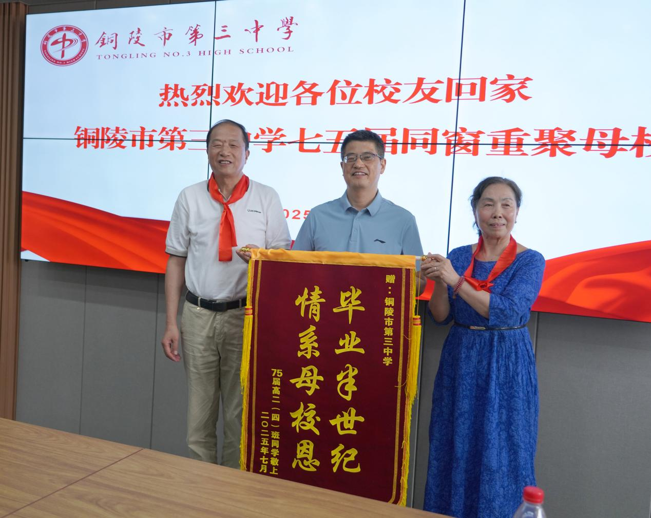 2025年7月16日,铜陵三中校园迎来了一群特殊的客人——铜陵三中75届毕业生们。五十载光阴荏苒,曾经风华正茂的少年少女,如今已是白发染鬓、步履沉稳的爷爷奶奶。一条条鲜艳的红丝带轻系于颈间,如不灭的青春火焰,映照着他们平均六十至七十岁的面容,也无声诉说着对母校跨越半个世纪的深沉眷恋。