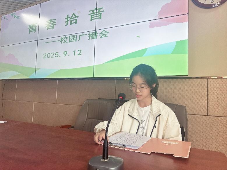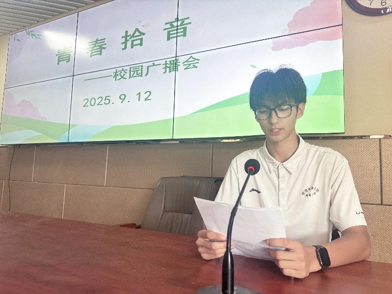 在世界的浩瀚拾取青春之音,于校园的点滴汇聚和正之风。各位同学们上午好,我是学生会广播站站长陶哲昊。每周的“青春拾音”广播与您准时相约。九三阅兵气势恢宏,震撼全球的同时,也让你我青春之心激荡澎湃。它让我们回望历史,也让我们思考何为青少年的责任与担当。在这蓬勃向上的时代,总有榜样如夏日长风,激励你我执笔书写时代的答卷。今天,2028届101班的舒文欣同学以《烈日当空,自有长风伴你我》为主题,分享她从九三阅兵中感悟到的青少年的责任和担当。